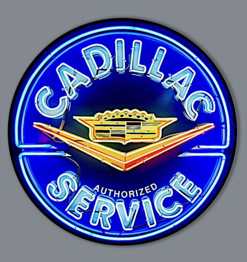Consignment / Call for availability and price / This rare 1940s-era flange sign is an original, genuine vintage porcelain Cadillac dealership sign. It underwent a meticulous 101-point neon r...