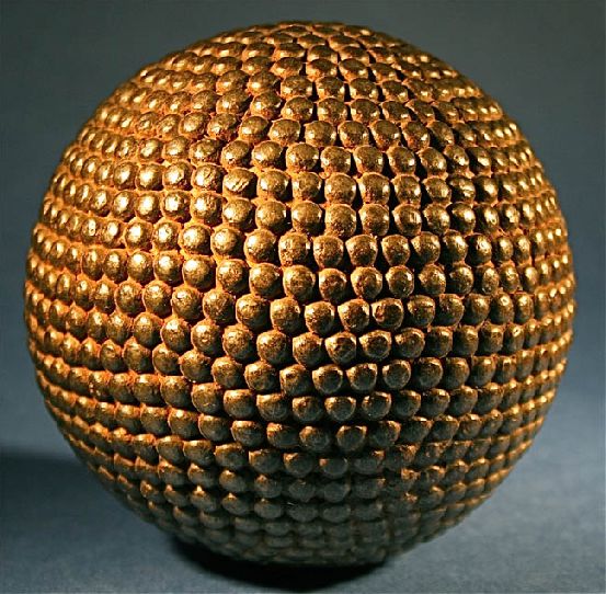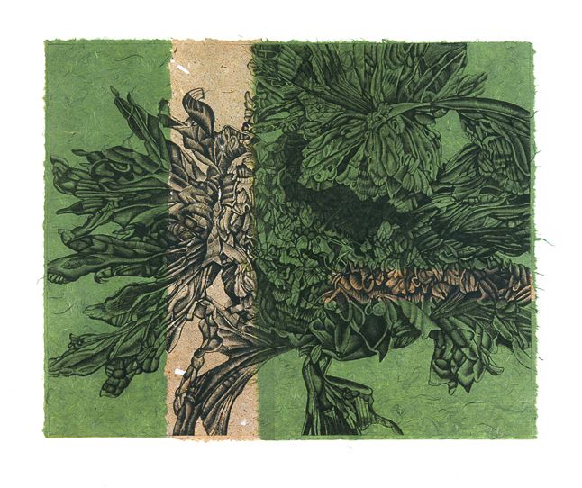 An imaginary sphere made of images of wilted hosta leaves which is on a pattern of other leaves. It is one of a series of "Flora Spheres" by the noted New York based photographer Russ Mar...