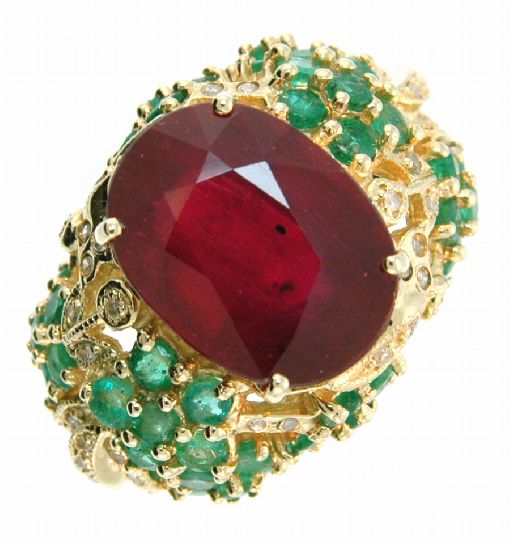 Her beauty is a Genuine Blood Red Ruby centerstone hi-lighted by Genuine Diamond cocktail ring that speaks wonders! She is even further encrusted in Genuine Colombian Quality Emeral...
