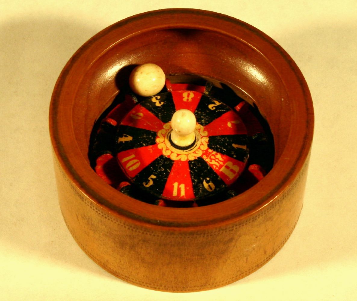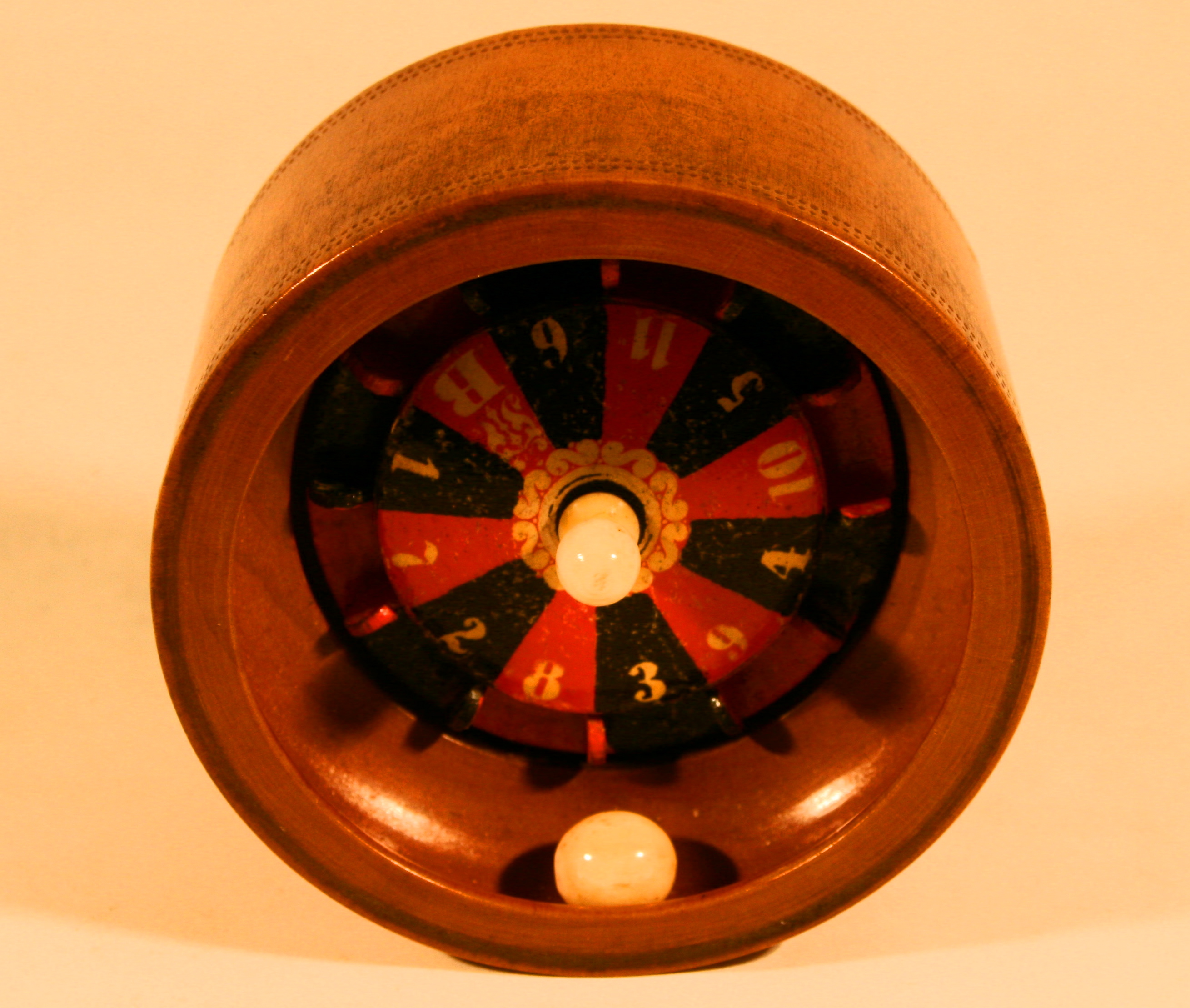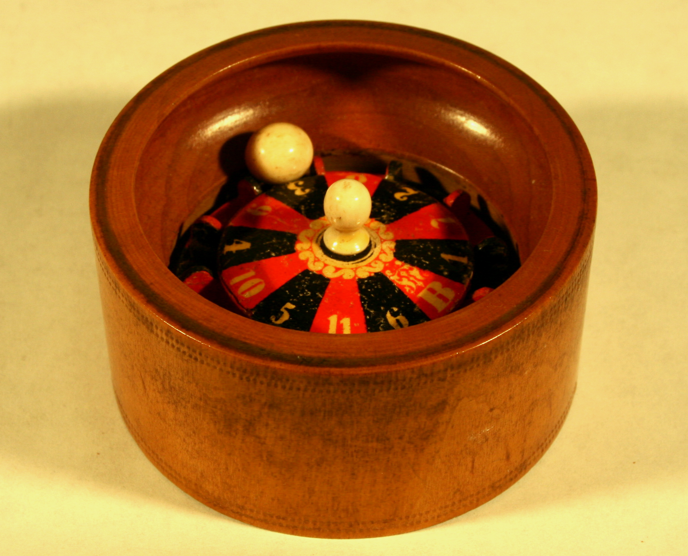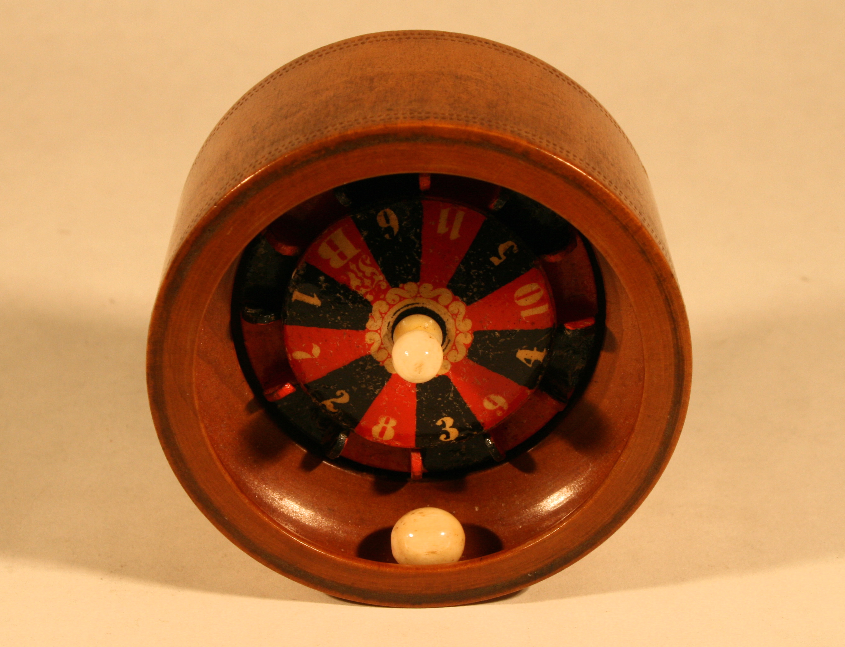 Vintage Wood, Metal and Ivory Roulette Wheel Condition is very good GAMBLING GAME SPINNER, 2 SIDES, 3 LONG. INTERESTING 19TH CENTURY GAME, ORIGINAL CONDITION. Roulette is a casino and gambling game named after the French word meaning "small wheel". In the game a croupier spins a wheel in one direction, then spins a ball in the opposite direction around a tilted circular surface running around the circumference of the wheel. The ball eventually falls on to the wheel and into one of 37 (in European roulette) or 38 (in American roulette) colored and numbered pockets on the wheel.