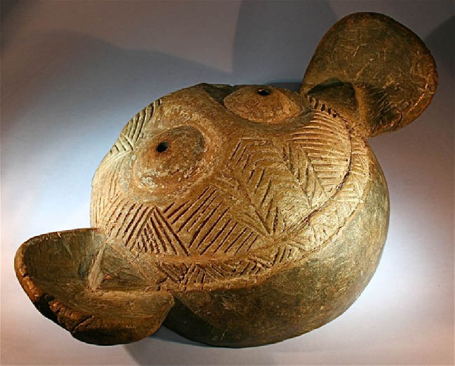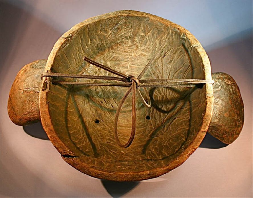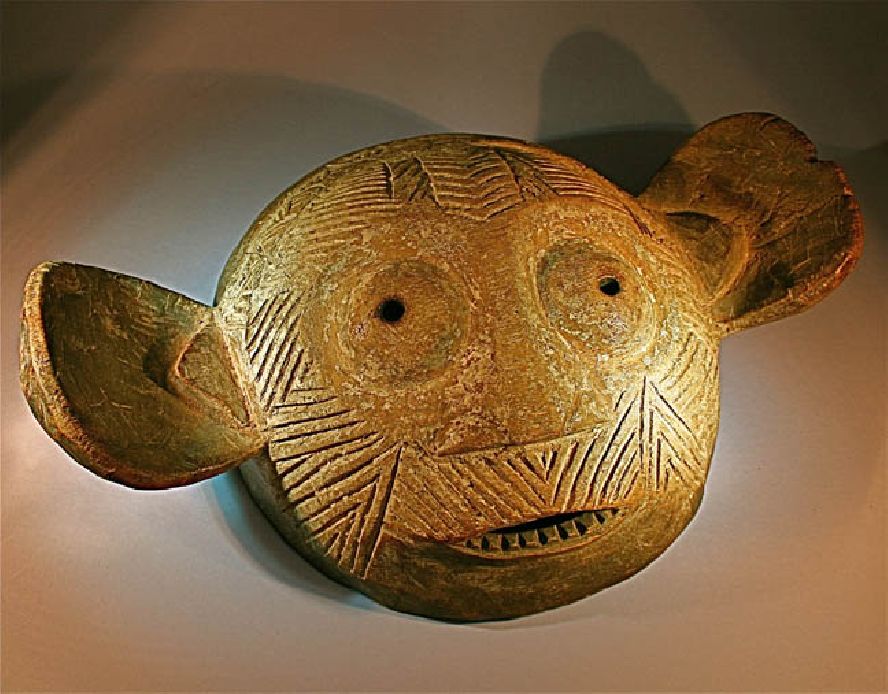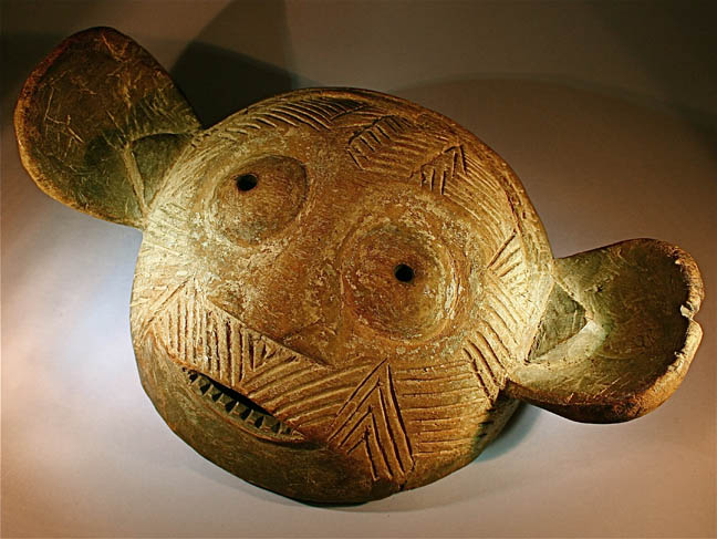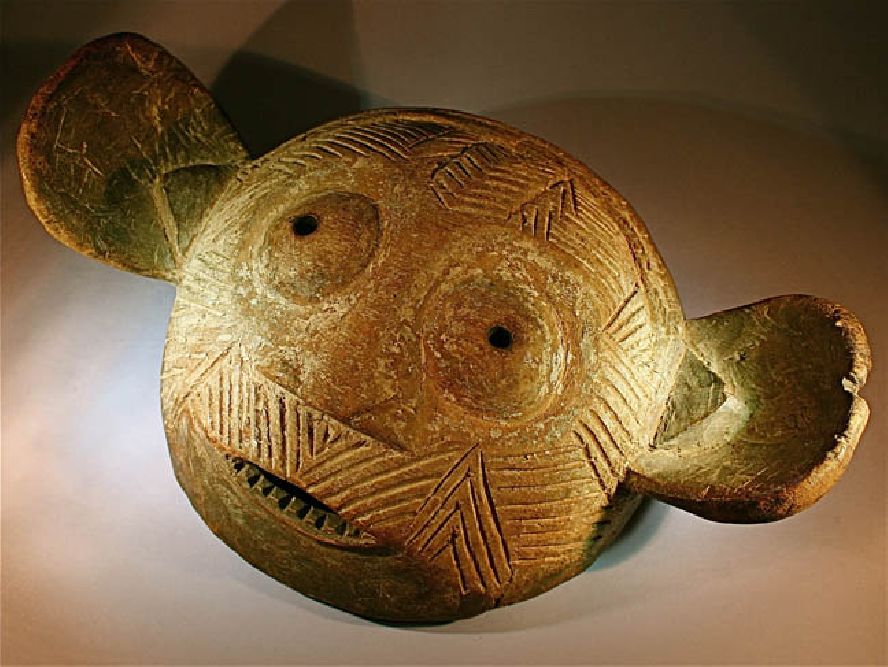 African hand carved ear mask African Art, African, Authentic quality Ceremonial or Ancestral African art, craft mask. A large round, imposing hand carved ear mask, The patina is handsome and it appears to be old. Although, the tribe that made the mask is not known, it should be kept in mind that tribes do not necessarily conform to state borders. The mask does not have any holes providing for it to be worn as a face mask. This, apart from the spotted white face, gives further reason to assume that is a ceremonial or ancestral mask that was used lying on it s back. The concave reverse of the mask clearly shows that it is carved out of one piece of wood. Unfortunately this is the most we can fined about this mask.