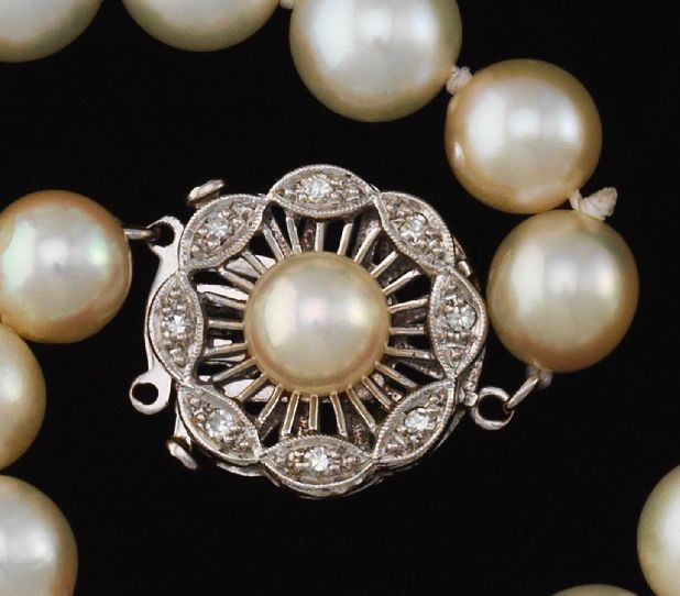 A spectacular find from a personal prominent estate / Vintage Ladies' Gold, Pearl and Diamond Single Strand Necklace 15 ΒΌ" 14k white gold slide-in clasp with safety catch, single strand pearl necklace, pearls measuring 7.25mm to 8.25mm; clasp accented with round single cut diamonds, total estimated diamond weight 0.08 ct; marked on the clasp; overall weight 35.7 gm. Condition: Very good. The finest quality of natural pearls have been highly valued as gemstones and objects of beauty for many centuries. Because of this, the pearl has become a metaphor for something rare, fine, admirable and valuable. Pearls have been harvested and cultivated primarily for use in jewelry, but in the past were also used to adorn clothing. They have also been crushed and used in cosmetics, medicines and paint formulations.