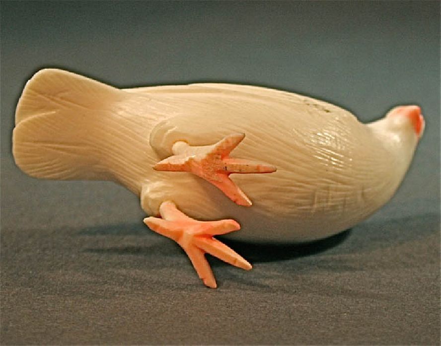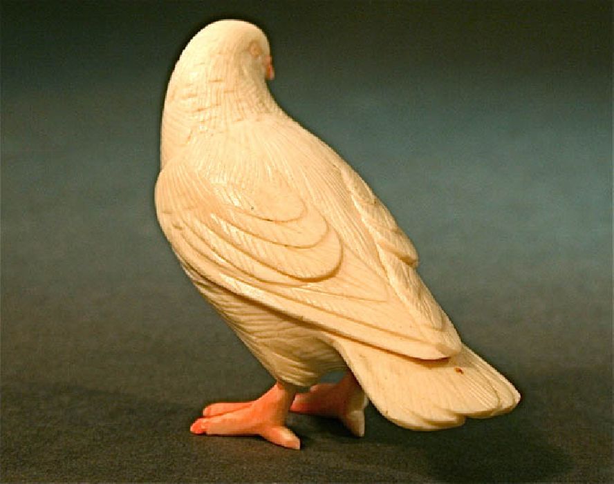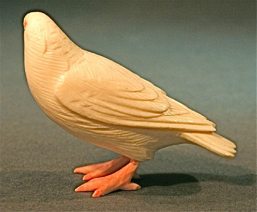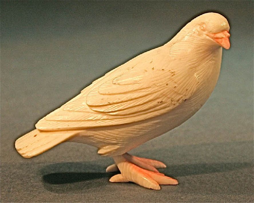 🔥 Note, if any material is found to be questionable after a thorough examination and a determination that it might violate existing legal regulations, it is important to emphasize that Busacca Gallery would be prohibited from selling or distributing such material in compliance with current laws. It should be noted that Busacca Gallery's ability to make such determinations relies on the physical and careful execution of comprehensive testing and meticulous scrutiny by scholarly experts well-versed in the relevant subject matter. The description represents a simple story and opinion with the intention of stimulating conversation and providing education through its historical narrative. Busacca Gallery diligently endeavors to adhere to legal regulations and apologizes for any misrepresentations or confusion. For any inquiries, please do not hesitate to contact us. 415-215-6533 🎯 A ivory pidgin carving of a Japanese bird A beautiful carving of a pidgin. This is a beautiful Japanese vintage hand-carved ivory-painted bird. The majestic crest is orange, and white with a little red in color and the bird has a flawless white soft polish. A fine piece for any bird lover. The carving is exceptional and it's showing all of its old age. Prices at auctions in the USA for collectible Japanese birds typically range from a few hundred dollars to a few thousand.