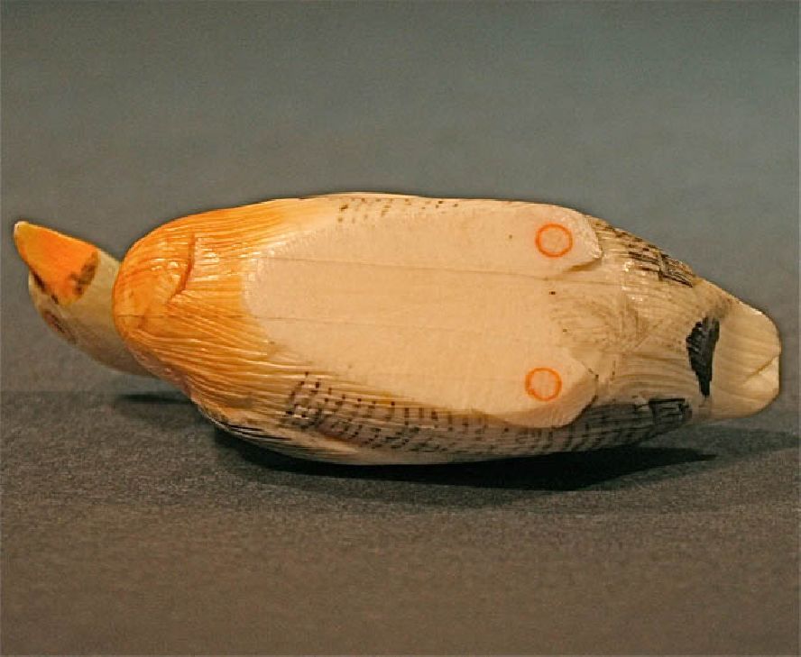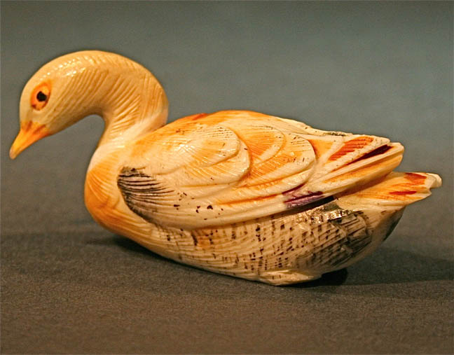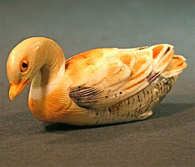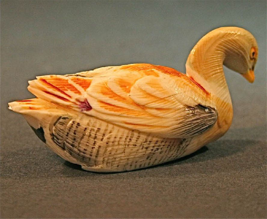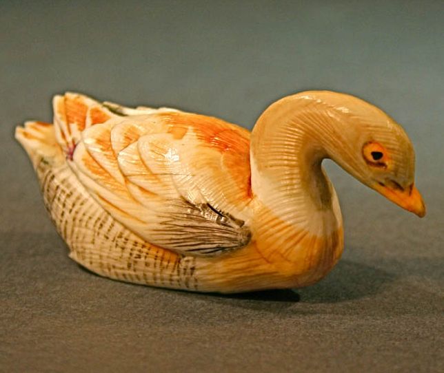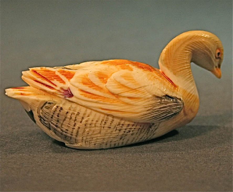 A ivory swan carving of a Japanese bird A beautiful carving of a swan. This is a beautiful Japanese vintage hand carved ivory painted bird. The majestic crest is orange, yellow, white and black gray in color and the bird has a flawless white soft polish. There are no feet on the bird. A fine piece for any bird lover. The carving is exceptional and it's showing all of it's old age. Prices at auctions in the USA for collectible Japanese birds typically range from a few hundred dollars to a few thousand.