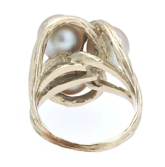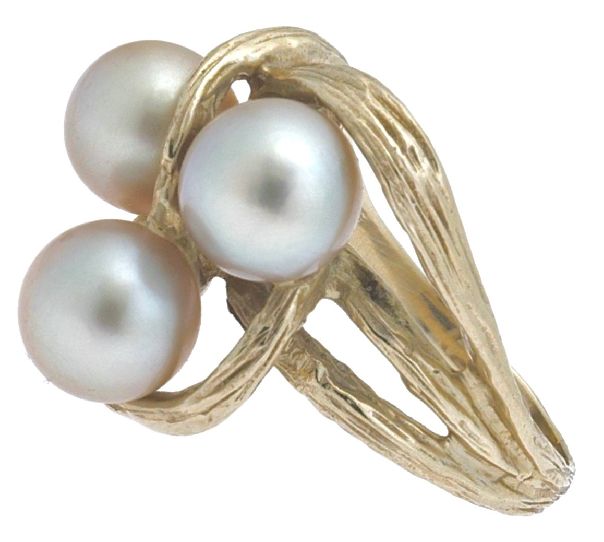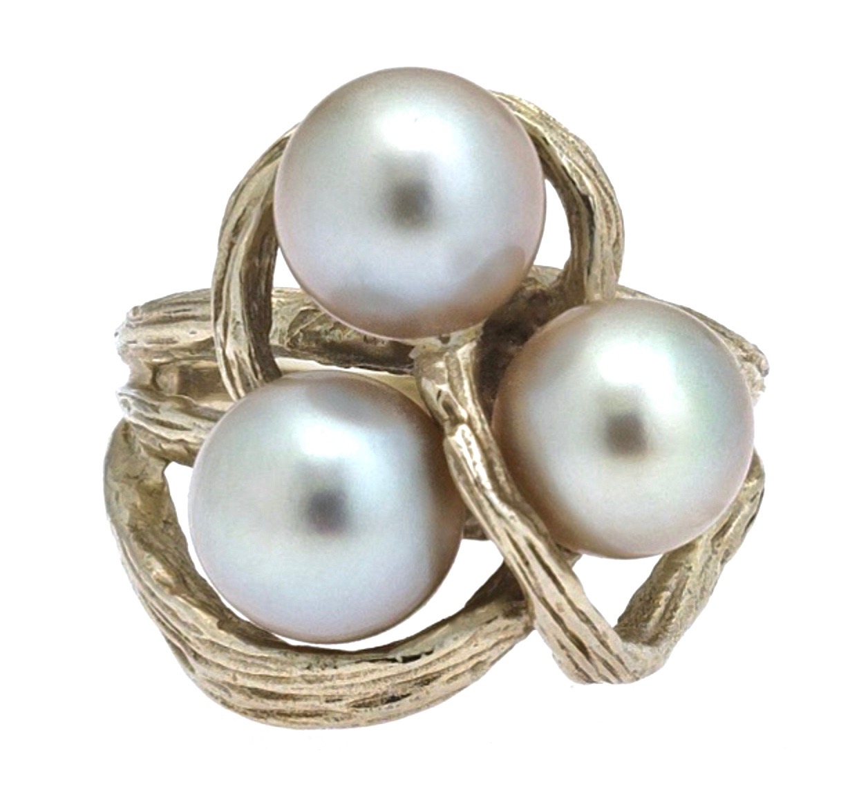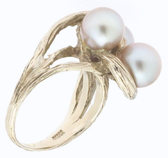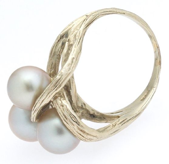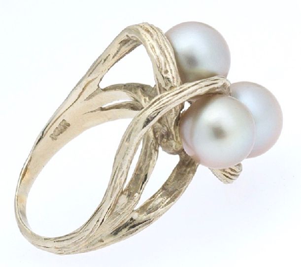 Ladies' Gold and Pearl Free-Form Ring Ring size 5.5 14k white gold openwork organic design free-form ring with a textured finish, set with three silver pearls, measuring 7 mm each; marked on the inside; overall weight 6.5 gm. Condition: Very good. The finest quality of natural pearls has been highly valued as gemstones and objects of beauty for many centuries. Because of this, the pearl has become a metaphor for something rare, fine, admirable and valuable. Fine quality natural pearls are very rare jewels. Their values are determined similarly to those of other precious gems, according to size, shape, color, quality of surface, orient, and luster. Single natural pearls are often sold as collectors' items or set as centerpieces in unique jewelry. Very few matched strands of natural pearls exist, and those that do often sell for hundreds of thousands of dollars. (In 1917, jeweler Pierre Cartier purchased the Fifth Avenue mansion that is now the New York Cartier store in exchange for a matched double strand of natural pearls Cartier had been collecting for years; at the time, it was valued at US$1 million.)