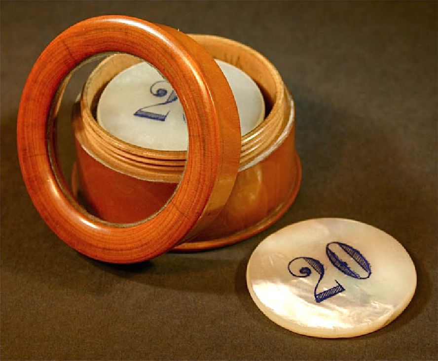 Gambling mother of pearl game chips with a glass wood box This is top casino memorabilia. These are hand made mother of pearl game chips with a wood box and glass top. It has six hand etched twenty dollar mother of pearl gambling chips. If you collect antique ivory poker chips this set is absolutely beautiful. They represent a time, a place and a culture, from obscure illegal Prohibition-era gambling halls to the casinos run by organized-crime figures. Antique casino memorabilia can sell for thousands. collectors and guardians think of them self as the keepers of the history of gambling around the world. "The chip collector has a love of history because the chips come from institutions that may or may not any longer be in existence. "Many of these hard to find chips are just absolutely beautiful."