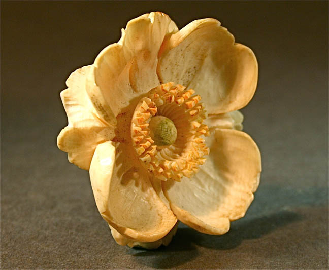Little antique hand carved ivory flower. This is a beautiful little hand carved ivory flower. It is a carved master piece of work. The piece is hand carved ivory and is very detailed. Within the flower you can see each individual petal and all of the carved ivory structure. The carving is exceptional and it's showing all of it's old age.