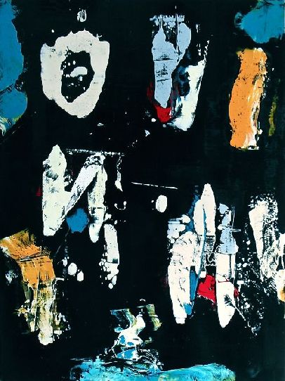 In the painting 'The Past Before Me,' I play with both flattening the surface and creating an abstracted landscape/lightscape. Light floats both behind and in front of the imaginary, coal-black galaxy. The work draws inspiration from the flat colors and text balloons found in comic books. I began to abstract them from the inside out, literally inverting the image down the middle, as if attempting to split a piece of paper through its core. I exaggerate this effect, creating a painting where composition takes precedence over content. By blending metallic paints with oils and acrylics, I further dramatize the aerial feeling and floating effect, allowing them to shine in an eye-popping arena before the black plane.