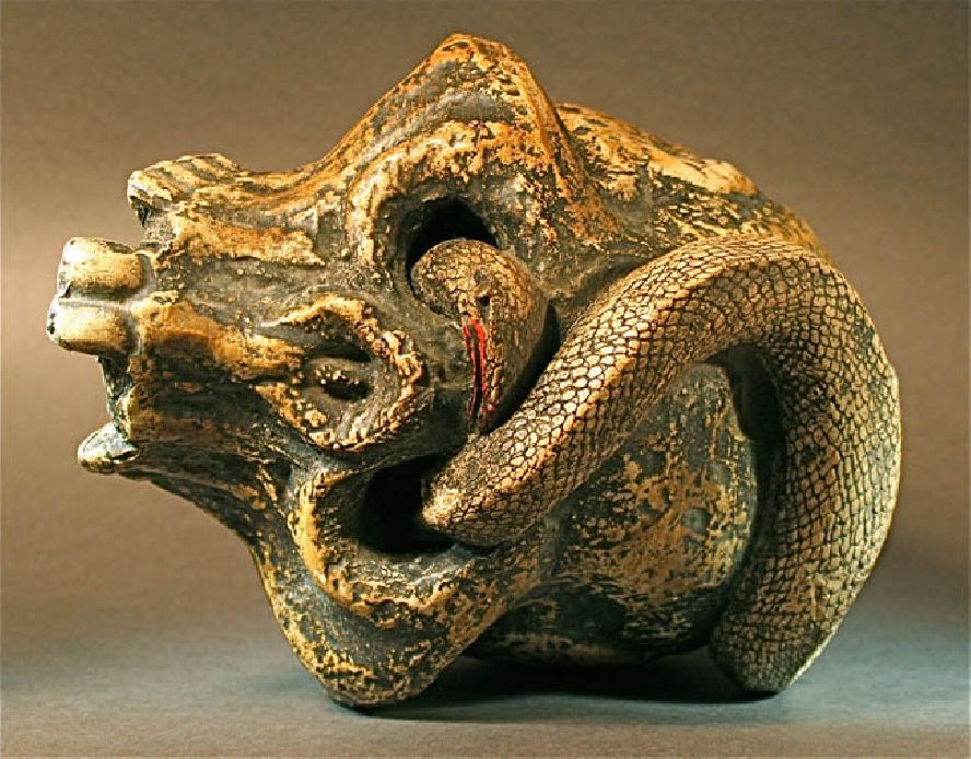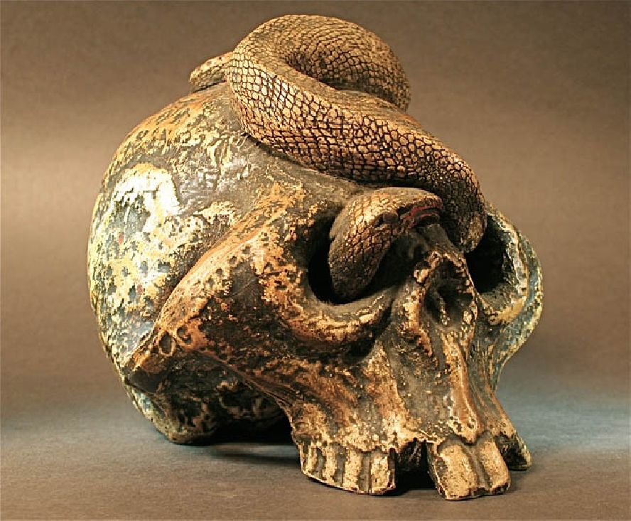An amazing art grave sculpture. Life-Sized Japanese Skull and Snake: Used to decorate a temple in Taisho, Japan, this ceramic skull could have been made as late as the 1920s. One end of the snake has slunk into one of the skull's eye sockets, while its other end seems to come out of the second eye hole, before retracting suddenly as the snake again springs out from its skull eye-socket. This sculpture has attracted a great deal of attention in the gallery.