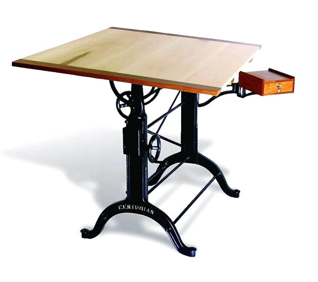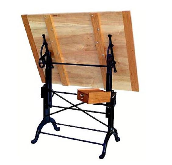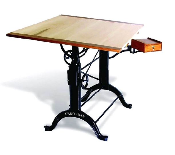 A drawing board (also drawing table, drafting table or architect's table) is, in its antique form, a kind of multipurpose desk which can be used for any kind of drawing, writing or impromptu sketching on a large sheet of paper or for reading a large format book or other oversized document or for drafting precise technical illustrations. The drawing table used to be a frequent companion to a pedestal desk in a gentleman's study or private library, during the preindustrial and early industrial era. During the Industrial Revolution draftsmanship gradually became a specialized trade and drawing tables slowly moved out of the libraries and offices of most gentlemen. They became more utilitarian and were built of steel and plastic instead of fine woods and brass. More recently engineers and draftsmen use the drawing board for making and modifying drawings on paper with ink or pencil. Different drawing instruments (set square, protractor, etc.) are used on it to draw parallel, perpendicular or oblique lines. A drawing table is also sometimes called a mechanical desk because, for several centuries, most mechanical desks were drawing tables. Unlike the gadgety mechanical desks of the second part of the 18th century, however, the mechanical parts of drawing tables were usually limited to notches, ratchets, and perhaps a few simple gears, or levers or cogs to elevate and incline the working surface. Very often a drawing table could look like a writing table or even a pedestal desk when the working surface was set at the horizontal and the height adjusted to 29 inches, in order to use it as a "normal" desk. The only give-away was usually a lip on one of the sides of the desktop. This lip or edge stopped paper or books from sliding when the surface was given an angle. It was also sometimes used to hold writing implements. When the working surface was extended at its full height, a drawing table could be used as a standing desk.