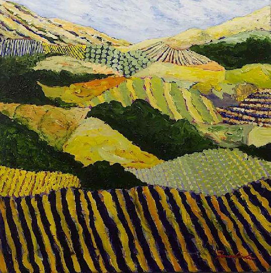 Allan Friedlander paintings are a process of exploration of moment-by-moment emotion. There are no messages or hidden agendas, other than to reveal the discoveries made during the process. Perhaps I do take cues from familiar surroundings and objects in my daily life. Hopefully the rich colors and shapes are the mysteries within my inner soul that find their way into my work, which is an evolution of discovery, not a road map. In my process I am quickly directed by the work, answering the needs, sorting the puzzles, and discovering solutions. I work with layers of thick and thin color and different objects as my tools to layer the paint to create texture all add to an eventual sense of accumulation and the essence of time and space. Allan Friedlander landscapes have vibrant colors, powerful expression, and dynamic composition along with great imagination, creating works of amazing depth and dimension to intrigue and disarm the viewer. In landscape paintings I try to communicate the beauty I see in simple things – color, textures, patterns and forms. I find the texture of objects especially fascinating. To me, it is very appealing to see how a myriad of forms are created inside the texture, and how these forms, which are created between the volumes of peaks and valleys on the surface, play together to build patterns that unify all the different forms. This piece would serve a business or residence well in offering guests a reason to stop in that hallway or den before moving on.