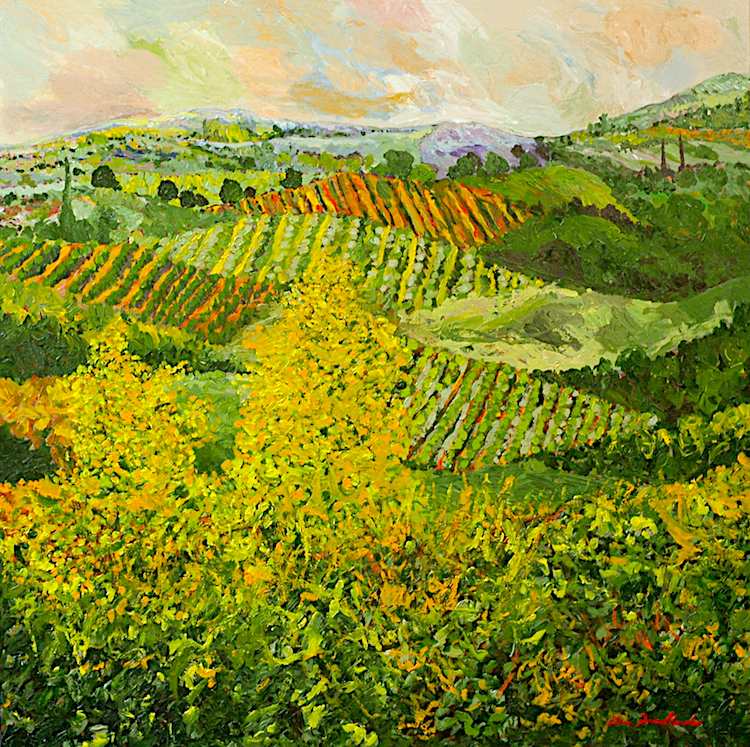 Allan Friedlander's paintings are a process of exploration of moment by moment emotion. There are no messages or hidden agendas, other than to reveal the discoveries made during my process. Perhaps I do take cues from familiar surroundings and objects in my daily life. Hopefully the rich colors and shapes are the mysteries within my inner soul that find their way into my work. My work is a evolution of discovery not a road map. In my process I am quickly directed by the work, answering the needs, sorting the puzzles and discovering solutions. I work with layers of thick and thin color and different objects as my tools to layer the paint to create texture all adding to an eventual sense of accumulation and the essence of time and space. Allan Friedlander's Landscapes have virbrant colors, powerful expression, and dynamic composition along with great imagination create works of amazing depth and dimension to intrigue and disarm the viewer. In my Landscape paintings I try to communicate the beauty I see in simple things – color, textures, patterns and forms. I found the texture of objects especially fascinating. To me, it is very appealing to see how a myriad of forms are created inside the texture, and how these forms, which are created between the volumes of the peaks and valleys on the surface, play together to build patterns that unify all the different forms. This piece would serve a business or residence well in offering guests a reason to stop in that hallway or den before moving on.