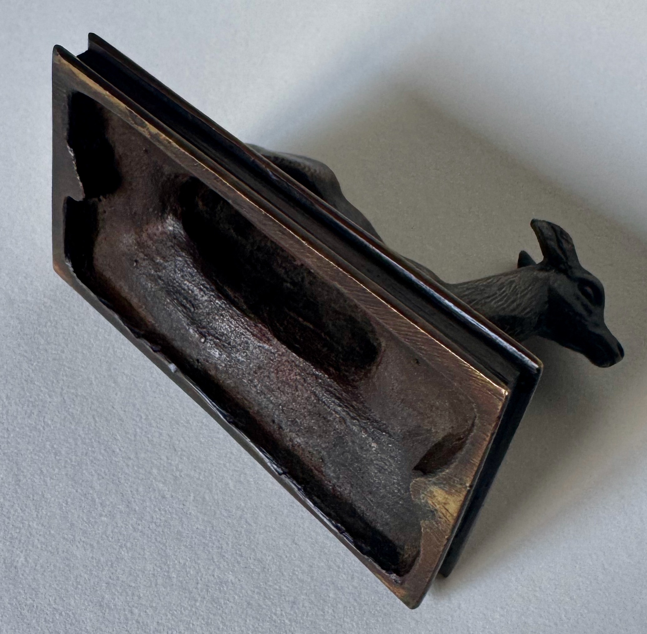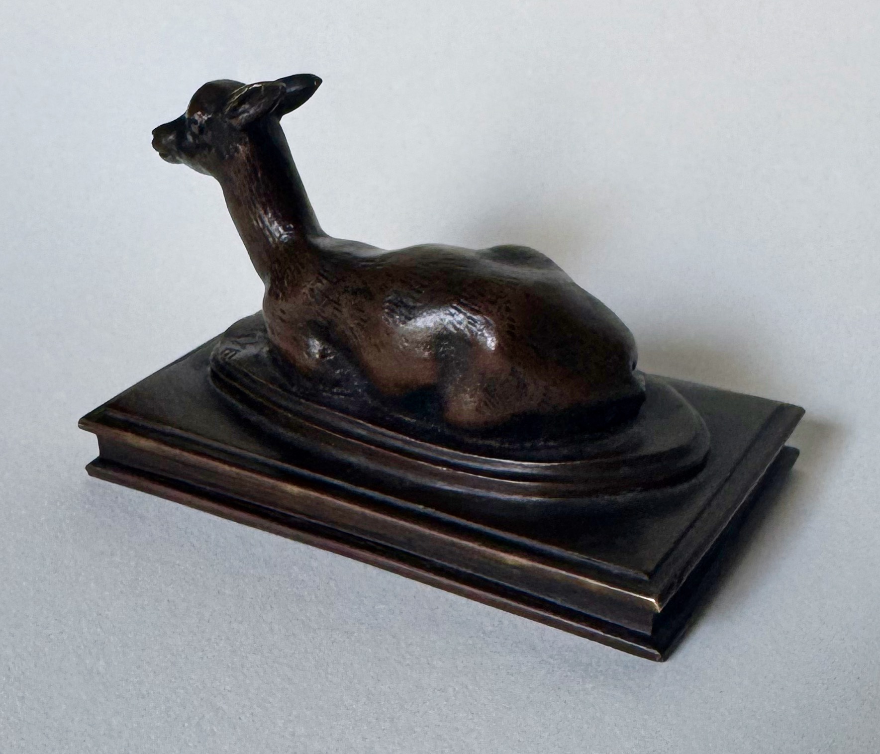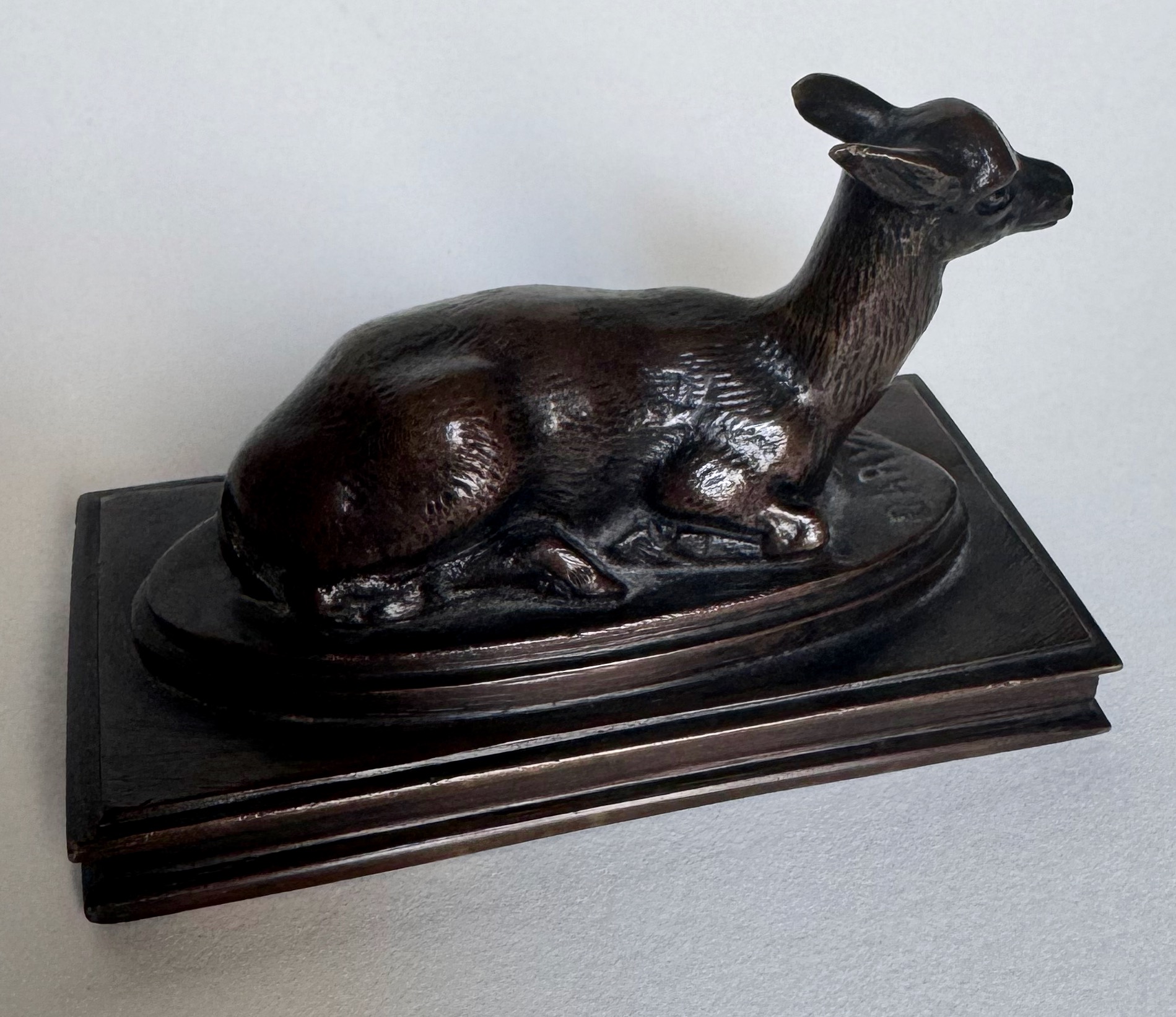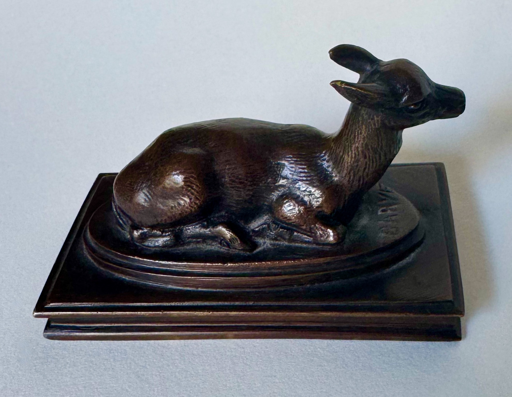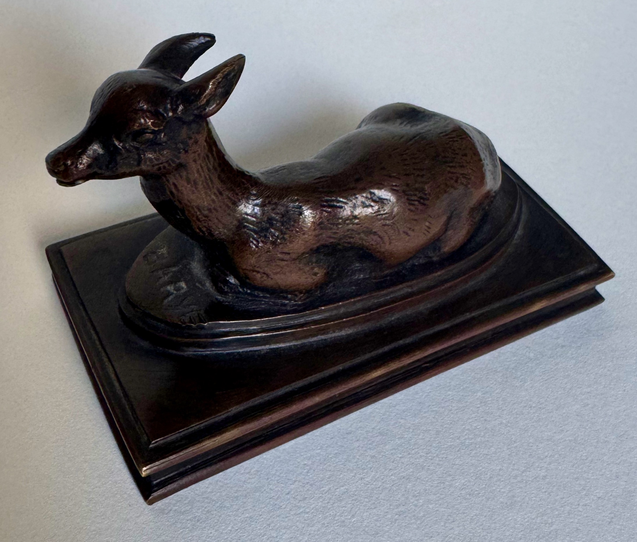 Sculpture artist ANTOINE-LOUIS BARYE (1796–1875). “Resting Fawn” Period: 19th century: Bronze with brown patina: Foundry: Barbedienne: Resting on a fully cast rectangular base; signed BARYE. The base features crisp detailing and a warm patina characteristic of Barye’s mid-19th-century foundry production. A similar model was recently sold in Paris, Avenue Hoche, for €3,840 (including premium). This finely detailed bronze, depicting a fawn in repose, is an early casting from the workshop of the celebrated French sculptor Antoine-Louis Barye, renowned for his animalier works. His sculptures were inspired by close observation of animals at the Jardin des Plantes in Paris. Comparable models are illustrated in The Barye Bronzes. Condition: Excellent Dimensions: L 3½ × W 2 × H 2 in Material: Bronze / In the 19th-century art scene, Antoine-Louis Barye emerged as a prominent figure, celebrated for his exceptional talent in animal sculpture. His mastery in capturing the vitality and character of animals made him one of the most sought-after sculptors of his time. While he is best known for his animalier works, Barye’s oeuvre encompassed a broader range of subjects, including mythological themes. Barye began his artistic training under his father, a goldsmith, and later studied with the masters François Joseph Bosio and Antoine-Jean Gros at the École Nationale Supérieure des Beaux-Arts in Paris, where he enrolled in 1818. Over the course of his career, he operated his own foundry, collaborated with architect Viollet-le-Duc on commissions from Napoleon III, and taught the young Auguste Rodin. A notable example of his engagement with mythological subjects is his interpretation of the Theseus legend, to which he returned on two occasions. One of these works depicts the legendary confrontation between Theseus, son of Aegeus, and the Minotaur within the labyrinth of Crete—a piece he presented at the Salon du Louvre in 1843. Antoine-Louis Barye, a master of 19th-century French sculpture, was celebrated for his dynamic animalier works and his exceptional skill in capturing movement and form. Over his distinguished career, he received prestigious commissions from Napoleon III, collaborated with leading architects such as Viollet-le-Duc, and operated his own foundry. As a respected educator, Barye also taught the young Auguste Rodin, leaving a lasting influence on the next generation of sculptors.