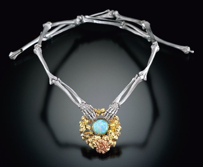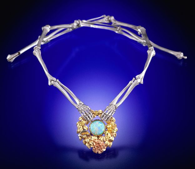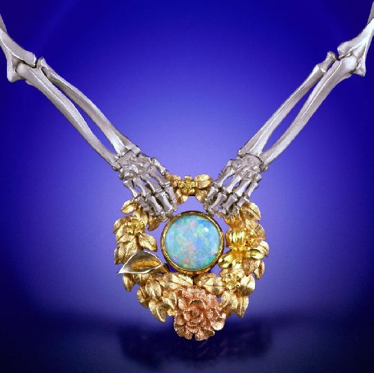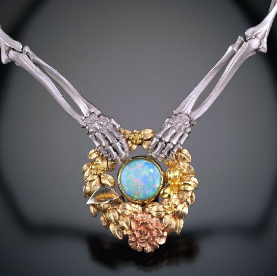 Hand-fabricated 'Memento Mori' necklace in Platinum, 22, 18 and 14 karat white, red, yellow and green golds. Set with a fine Australian Fire Opal weighing 3,35 carats. The wreath is composed of an oval frame of green gold leaves which harbor a multi-colored floral variety. A rose in red gold, an orchid of 22kt yellow gold, a calla lily in white gold with a 22kt yellow gold stamen, along with several 18kt Royal yellow gold forget-me-not blooms. The skeletal hands, arm and leg bone links are all fastidiously made to interlock with a fluid anatomical precision. The clasp is a cleverly designed 'lentoid' mechanism that enables the femurs to securely interlock and rotate yet remain hidden. Unique edition: 01/01