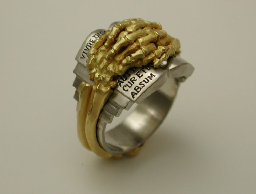 A unique Gentleman's 'Memento Mori' ring in 18 karat yellow gold and Palladium (Platinum family). The skeletal arms and hands encircle an open book which has upon the open pages engraved and inlaid with black enameling the following quotations: Viver disce, cognita mori. (Learn to live, remember Death.) Tu fui, ego eris. (What you are, I was. What I am, you will be.) Cur etiam hic es. (Why are you still here?) Aut disce aut discede. (Either learn or leave.) Cave ab homine unius libre. (Beware of anyone who has just one book.) Absum! (I'm outta here!) These epigrams and transcriptions were found while researching Italian mortuary art. Limited edition: 03/05 The ring is a size 9 (American Standard) nad can be resized to your specifications without altering the design. The yellow gold skeleton portion is rivited to the Palladium base. *All of the art is edited and chosen by us for its high quality and workmanship before posting. These collectibles have been selected with the artist & collector in mind. We are committed to enhancing our customer’s lives by discovering creating, and pointing out only the best art we can find in the world today. We Are Taste-Makers, Art Advisers, Consultants & Publishers Of Spectacular Art Stories. Our job is to be intermediaries between buyers and sellers. We are vetting for high end art patrons. We are determined to catalog the world's most exceptional art and share it with everyone.