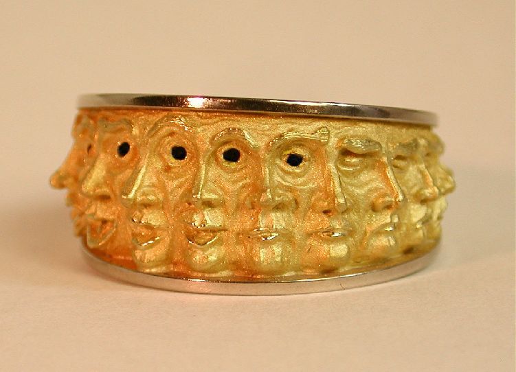 Artist Kim Eric Lilot: "Entitled the 'Bi-Polar Ring' this design of hand-chased three dimensional sculptural faces depict a dramatic humorous spectrum of human emotions. Beginning with the central 'normal' portrait the faces on the left side gradually change their emotional moods from happiness into extreme euphoria. The faces on the right side depict the emotional shifts from sadness into rage. The faces merge at the ring's base into a series of grotesques or caricatures. Note the shared eyes. This technique of portraiture originated in ancient Asian religious iconography exemplified, for example, in Hindu and Buddhist sculptures in Angor Wat, Cambodia. This is a unique, limited edition ring (06/10). 18 karat yellow gold with Platinum borders and enameled eyes. The ring is a size 9 1/2 (American standard sizes) but can be adjusted without altering the seamless design."