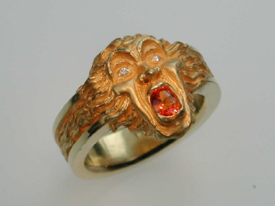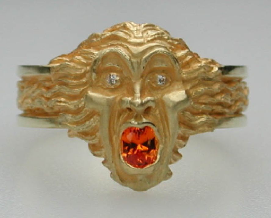 Beautiful, extremely rare hand-chased and engraved Bas' relief carved ring in the Gargoyle Series. In an antique satin finished 18kt royal yellow gold. Additionally, the ring is set with two Brilliant-cut diamond eyes and a natural, untreated oval-cut Padparadsch sapphire weighing 0,86 carats.