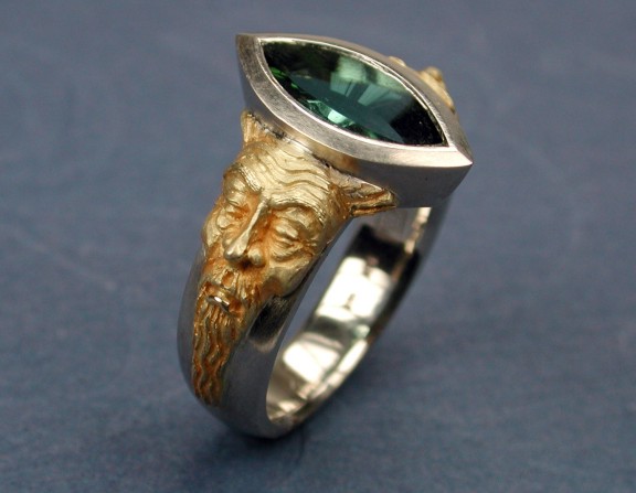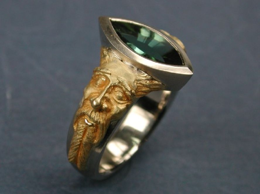 The faces are hand-chased and engraved in satin-finished antique 18 karat royal-yellow gold. The body of the ring is fabricated in Palladium (Platinum family). The bezel-set Marquis-cut gemstone is a 1,74 carat 'Contect-cut' green tourmaline.