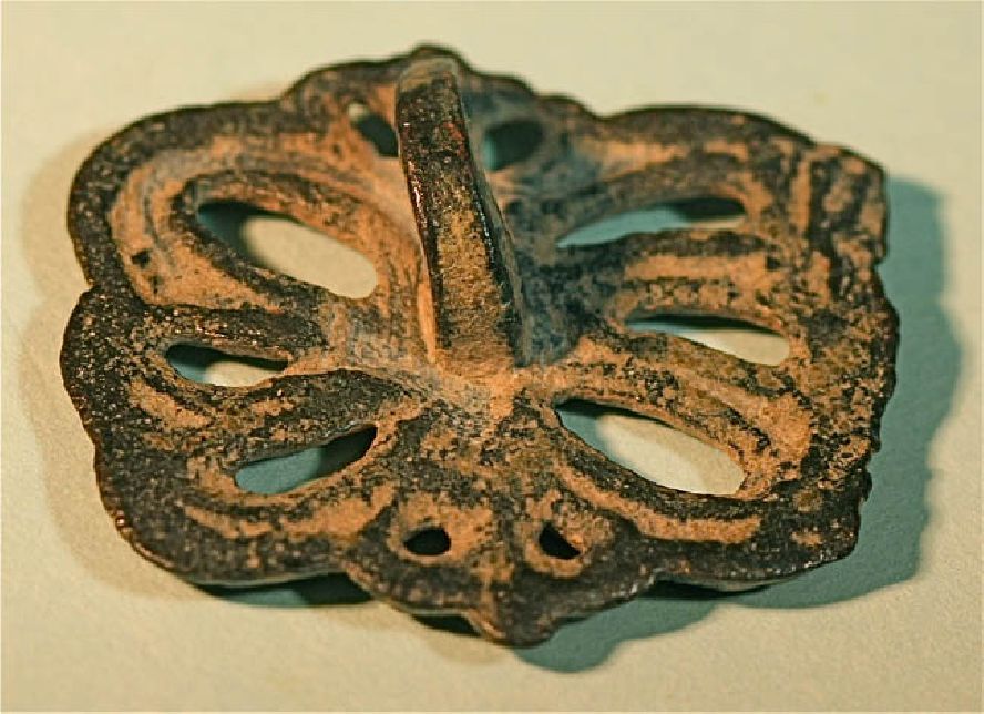 Roman button, handmade Ancient Artifact, excavated field molded cast button. This would be a fine addition to an artifact button collection. Though it is deteriorated, as you may see from the photos, the butterfly design on the front seems to be one of a kind. Buttons and button-like objects used as ornaments rather than fasteners have been discovered all around Ancient Rome. Some buttons were carved into geometric shapes and had holes pierced into them so that they could be attached to clothing by using a thread. The button, in fact, was originally used more as an ornament than as a fastening.