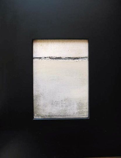 White, Black No. 2, oil on canvas, Height 5" x Width 7", ½” Depth, Wood Black Frame, 12 x 14". The artist Michelle Tholen creates a lure of light in color and form, suggesting more than color and form: founded in the spiritual. Inbreathed form and color with spirit moves, transcends, illumines, fills and enlivens. The feeling is of promise yet realized within one’s imagination.