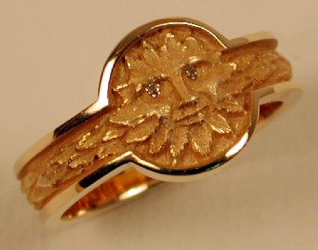 Artist Kim Eric Lilot, A beautifully carved and hand-chased bas' relief 'Sun Ring' in an antique, satin-finished 18 karat royal yellow gold and set with two Brilliant-cut diamond eyes. This ring is made in a size 7 (American Standard) but can be resized without altering the seamless carved detail that encircles the entire ring. Hallmarked: KIM, 18kt.