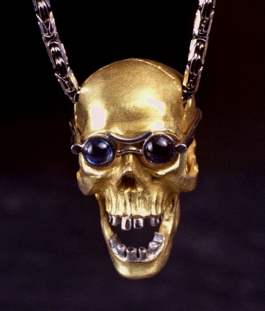 Artist Kim Eric Lilot: A uniquely dramatic hand-fabricated 18 karat yellow gold 'Memento Mori' Skull Pendant with 14kt karat white gold teeth and Platinum/Iridium eye-glass frames that are inlaid(bezel-set) with natural, Blue Sapphire cabochon-cut gemstone lenses. A 20" long 18kt yellow gold Italian chain is included. A chain of different length or design can be provided however this design was chosen because of it's fluid and non-abrasive movement.