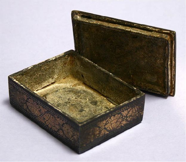 Bidriware is a metal handicraft that originated in Bidar, Karnataka, in the 14th century C.E., during the rule of the Bahamani Sultans. The term 'Bidriware' originates from the township of Bidar, which is still the only town that manufactures the unique metalware. Due to its striking inlay artwork, Bidriware is an important export handicraft of India and is prized as a symbol of wealth. The metal used is a blackened alloy of zinc and copper inlaid with thin sheets of pure silver. The origin of Bidriware is usually attributed to the Bahamani sultans who ruled Bidar in the 13th–15th centuries. Abdullah bin Kaiser, a craftsman from Iran was invited by the Sultan to work on decorating the royal palaces and courts. According to some accounts, Kaiser joined hands with local craftsmen and gave birth to Bidriware. Since then, the craft has been handed down succeeding generations mostly among the local Muslim and Lingayat sects. Bidriware is manufactured from an alloy of copper and zinc (in the ratio 1:16) by casting. The zinc content gives the alloy a deep black color. First, a mould is formed from soil made malleable by the addition of castor oil and resin. The molten metal is then poured into it to obtain a cast piece which is later smoothened by filing. The casting is now coated with a strong solution of copper sulphate to obtain a temporary black coating over which designs are etched freehand with the help of a metal stylus. This is then secured in a vise and the craftsman uses small chisels to engrave the design over the freehand etching. Fine wire or flattened strips of pure silver are then carefully hammered into these grooves. The article then is filed, buffed and smoothed to get rid of the temporary black coating. This results in rendering the silver inlay hardly distinguishable from the gleaming metallic surface which is now all silvery white. The bidriware is now ready for the final blackening process. Here, a special variety of soil which is available only in the unlit portions of the Bidar fort is used. It is mixed with ammonium chloride and water to produce a paste which is then rubbed onto a heated bidri surface. The paste selectively darkens the body while it has no effect on the silver inlay. The paste is then rinsed off to reveal a shiny silver design resplendent against the black surface. As a finishing touch, oil is applied to the finished product to deepen the matt coating. The finished product appears black with brilliant silver inlay.