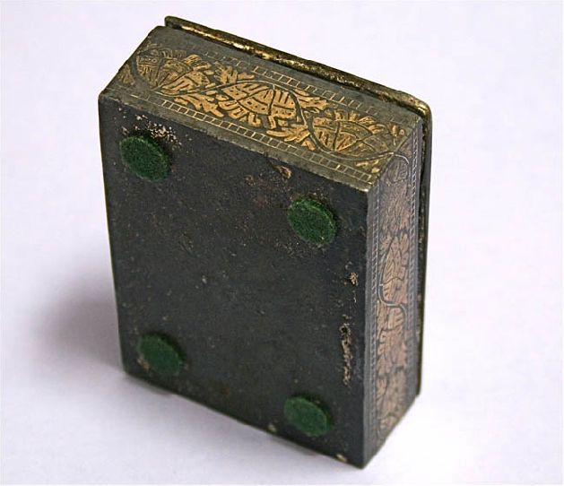 This whimsical box was designed for making pan, the Indian digestif, and is composed of a small compartment that would hold the ingredient. The surface of the box is delicately filigreed with quatrefoil flowers, the petals of which are filled with ivy leaf and lotus bud motifs. A lovely antique commemorative Lndian silver box, beautifully Bidri ware inlayed and engraved. on the lid with two different armorials. The sides of the box are decorated with an attractive flower and leaf design, and the interior is silver.