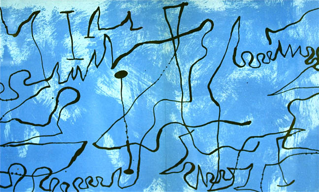 Joan Miro (Spanish, 1893-1983) (Untitled Blue) "Plate 3 - Untitled". Lithograph in colors on paper from the series of eight pieces including the cover published in 1956 by Jacques Prevert and Georges Ribemont Dessaignes, not signed, with folio fold marks, approx. 9" x 15" paper size, framed, overall approx. 16" x 22". The lithograph is in excellent condition. From the series of 8 pieces including the cover (not shown) published in 1956 by Jacques Prevert and Georges Ribemont Dessainges - Lithograph in colors from his early works printed by MAEGHT. 9" X 12.5" Lithographs by Joan Miró.