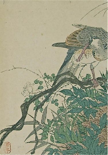 Unframed Japanese woodblock print in colors, by the artist Keinen. This is a beautiful antique woodcut, printed on hand-made paper. Full of vibrant color and strong outlines, this particular wprint depicts a Japanese bird of prey cleaning itself. It's a kacho-e (bird and flower print), approximately 12-1/2" x 8-7/8", oban size, hinged into a mat but not framed. Condition: Some surface wear, creases, and stains.