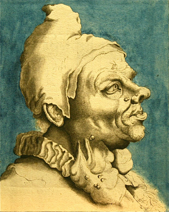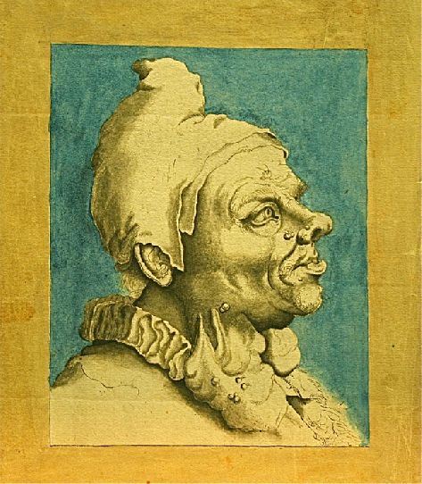 This Ogre or Troll concept art comes from somewhere in northern Europe. This great 18th or 19th century watercolor is not signed by the artist, whose warm fresh colors blend perfectly with the blue-gray wash and the golds and beiges of the decor. The painting is on old watercolor paper. There are a few very light spots of discoloration.