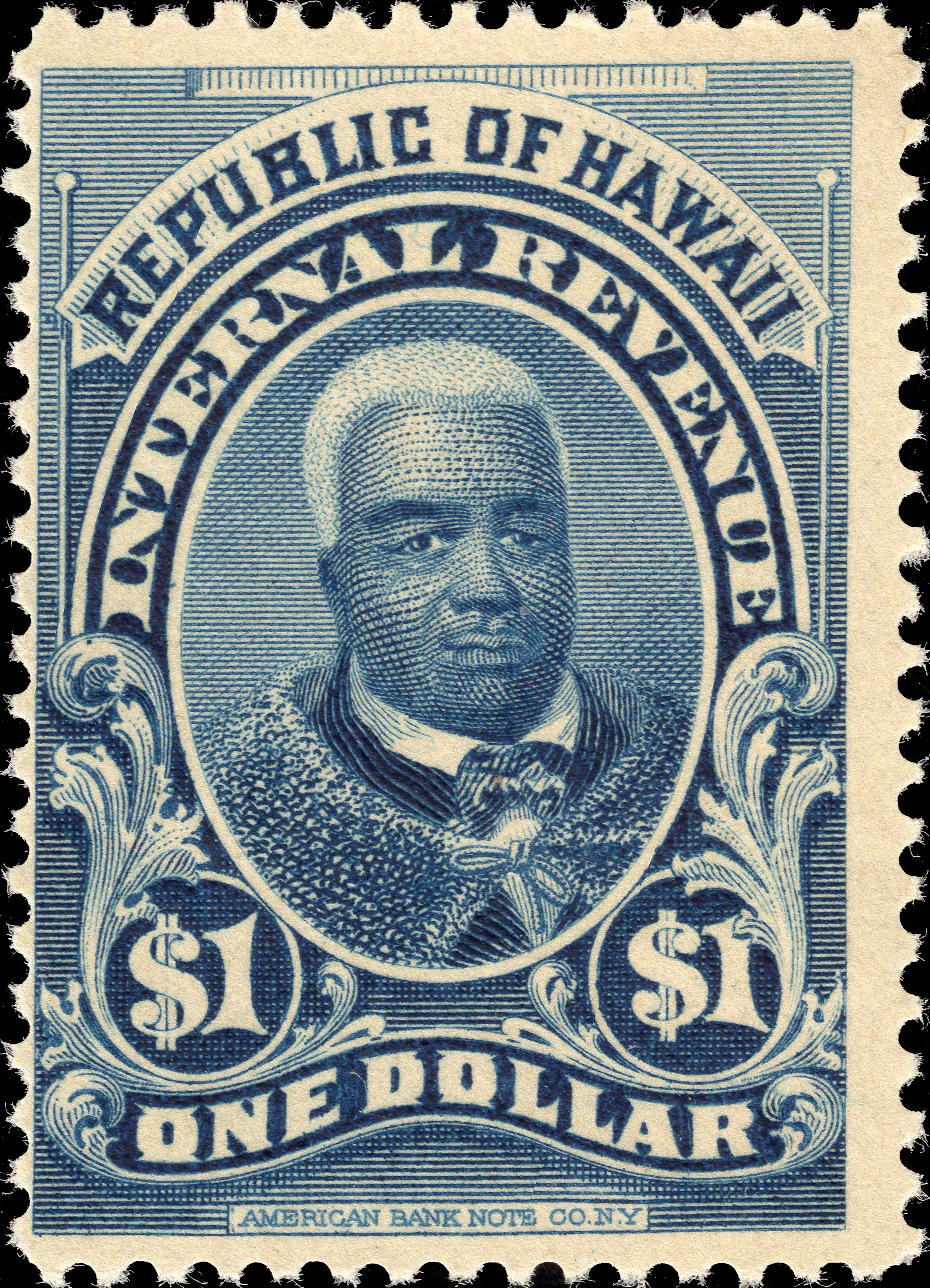 A choice specimen of a Hawaiian 1 Dollar revenue stamp. Issued by the Kingdom of Hawaii this stamp features a portrait of King Kamehameha I, the first King of Hawaii. Printed by the American Banknote Company in New York City.