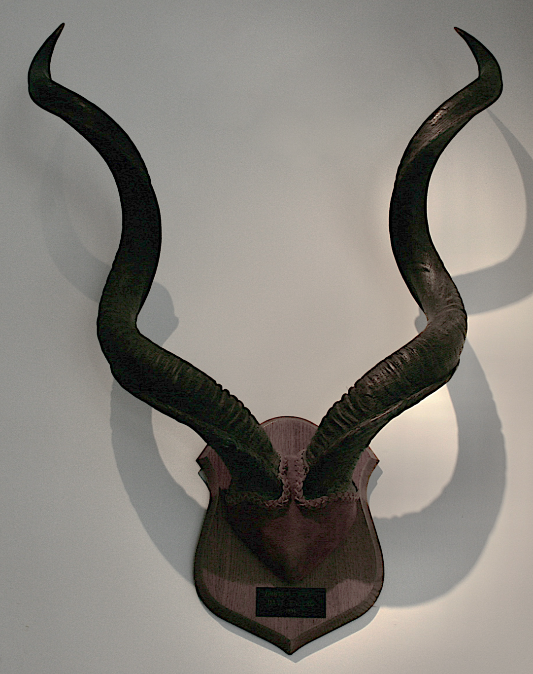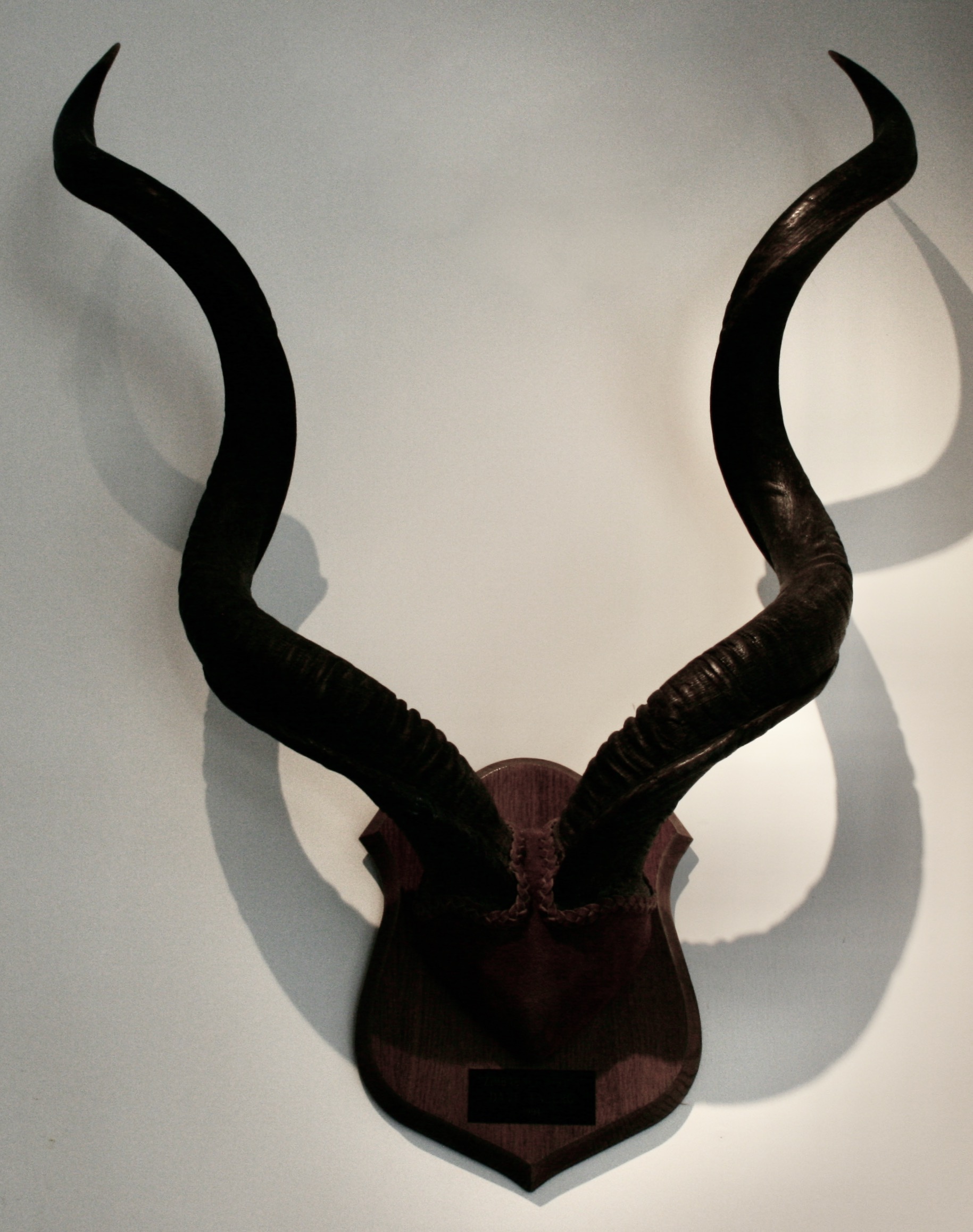 A beautiful set of African Kudu horns / African Greater Kudu Taxidermy Mount - Euro Skull mounts for Sale Striking African Kudu Horns mounted on a nice wooden plaque. The skull plate is covered with a quality leather covering. The horns are symmetrical and have good coloring and this piece will make for the perfect decor piece for the safari themed room. The quality is rated at "Excellent." A must-have mount for the trophy room or hunting lodge. Scientific Name: Tragelaphus strepsiceros / Approximate Size: 40" tall x 33" wide x 11" deep. Weight: 15 lbs. The Wall hanger is attached. Hangs from single, well-anchored heavy duty screw. Greater kudu bulls have long, spiral horns; occasionally a female will have small ones. The greater kudu's horns are spectacular and can grow as long as 72 inches, making 2 1/2 graceful twists. These beautifully shaped horns have long been prized in Africa for use as musical instruments, honey containers, and symbolic ritual objects. In some cultures, the horns are thought to be the dwelling places of powerful spirits, and in others, they are a symbol of male potency. The horns are seldom used in defense against predators; nor are they an impediment in wooded habitats-the kudu tilts the chin up and lays the horns against the back, moving easily through dense bush.