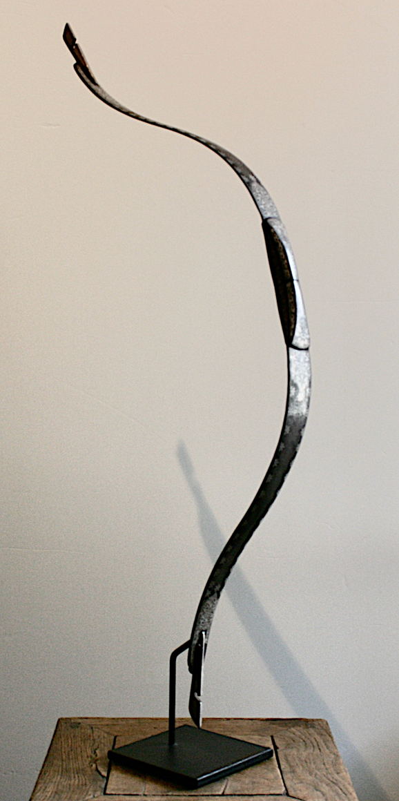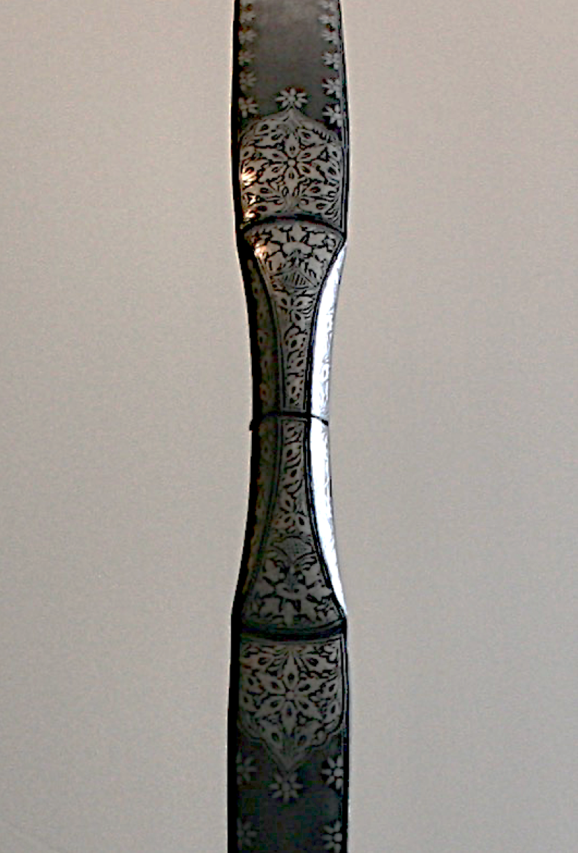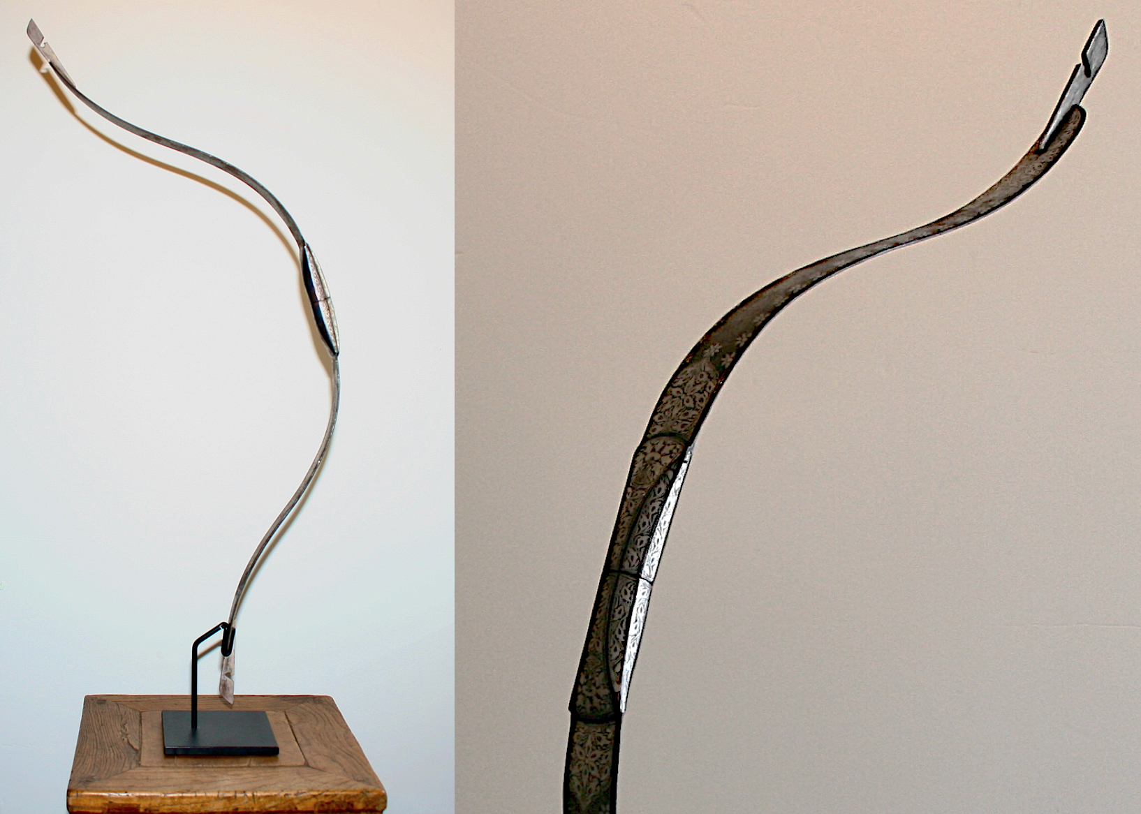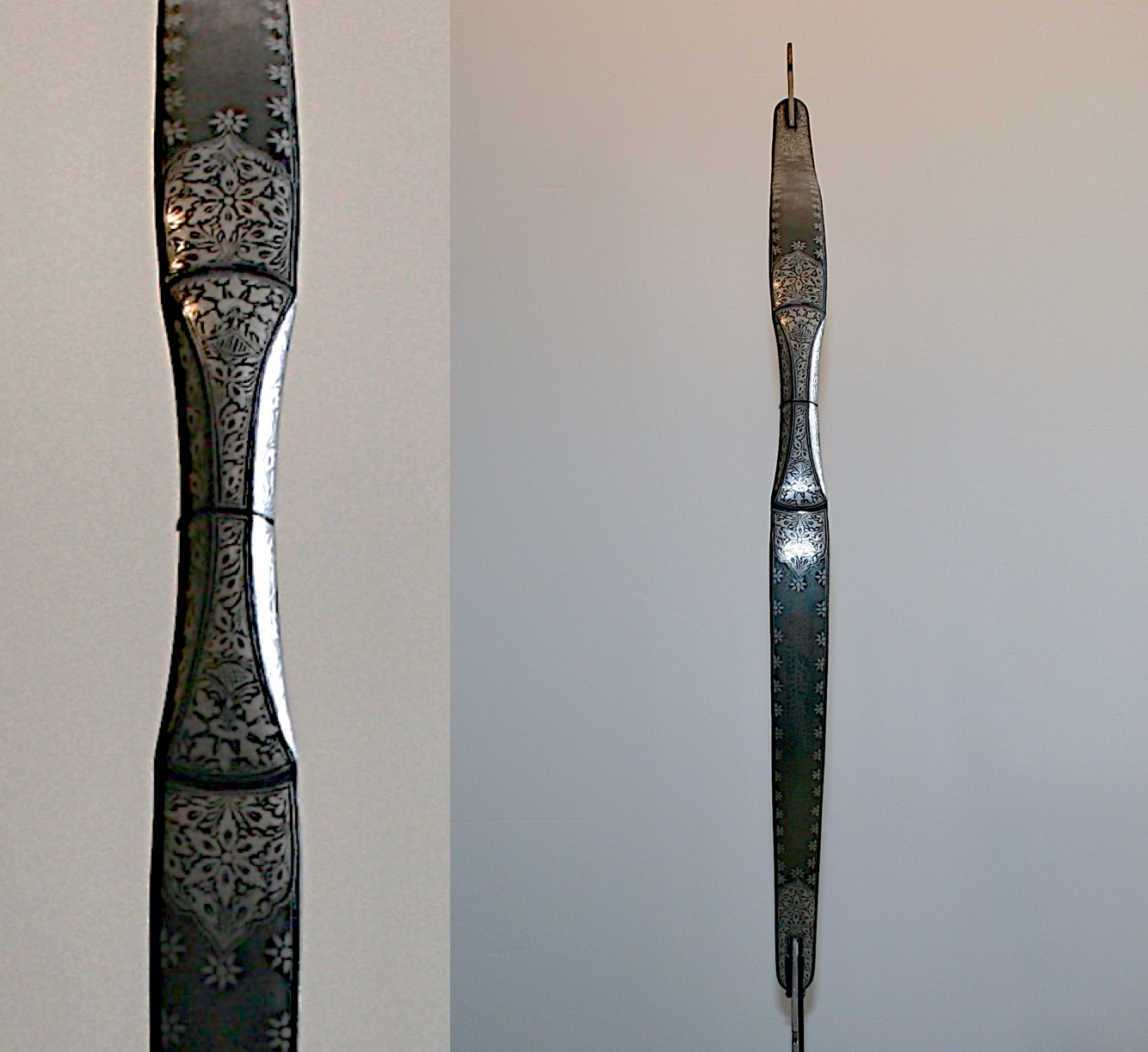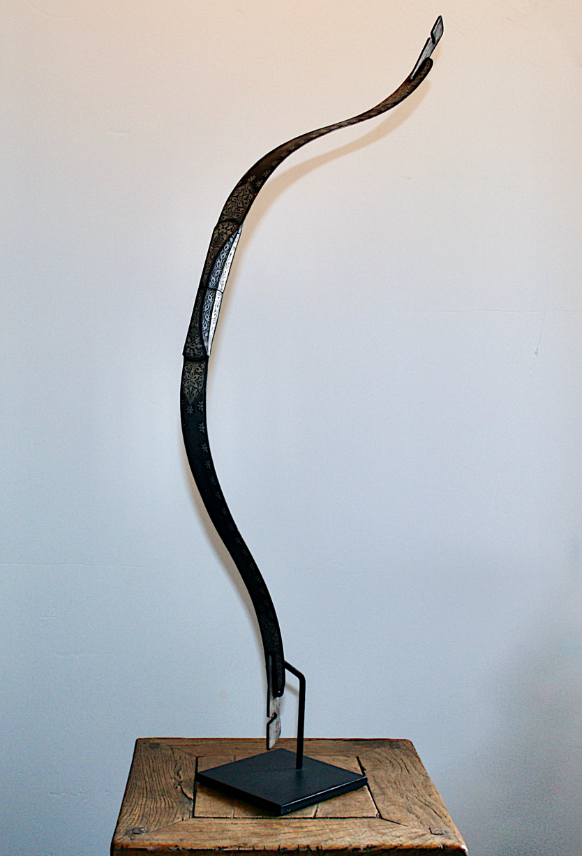 An Indian antique steel bow, 19th century. A fantastic example of an antique silver inlaid Indian Persian bow weapon for an arrow. A superb quality antique,19th century. Indo Persian steel bow of typical form, recurved form composed of two elements connected together at the central swelling grip. The exterior finely chiseled and engraved in relief with a classical Indian Asian Persian design. Absolutely beautiful workmanship! Showing the age, wear, and usage, with nice age patina. Incised with panels of stylized sterling silver designs and flowerheads within damascene panels of foliate scroll -- 32½in. long. Come's with a custom black steel stand. Damascene niello floral Oriental motifs. Finished with an overall swirled oxidized pattern. Any condition statement given, as a courtesy to a client, is only an opinion and should not be treated as a statement of fact. CIRCA: 19th Ct. ORIGIN: Indian Sub-Continent. More detailed condition requests can be obtained via email.