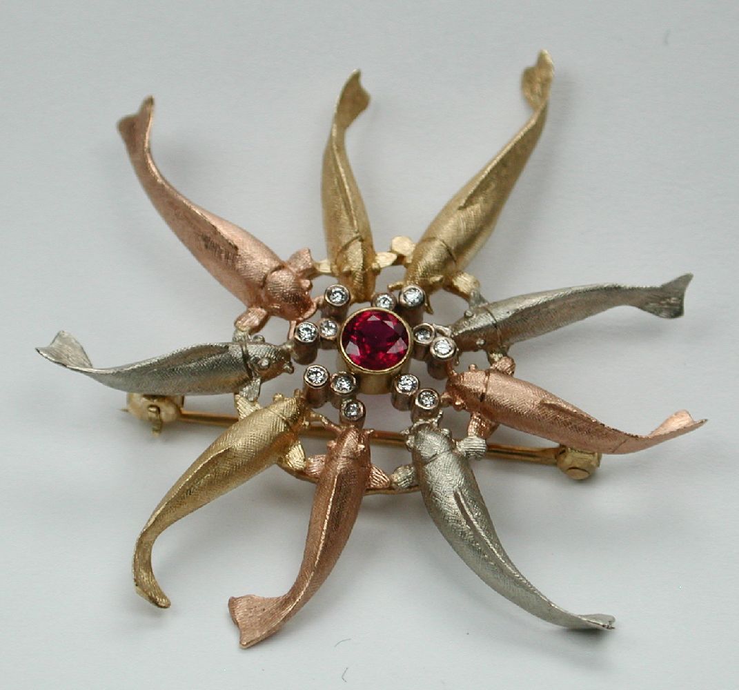 Artist Kim Eric Lilot: "This sculpturaly dramatic, fluid brooch is hand-fabricated, chased and engraved in multi-colored 18 and 14 karat yellow, red, white and peach golds. The fine Burmese Ruby gem center (0,67 carats) is surrounded with twelve (12) fine bezel-set Diamond 'bubbles'. Inspired by the Koi ponds on a beautiful spring morning in San Francisco's Japanese Tea Gardens. A unique, one-of-a-kind edition: 01/01
