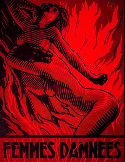 A image of black and white nudes. The cover is the only one in red. This is a woodcut in colored paper, not framed. Condition: Very good condition. Not framed. Hard to find, these are for the world woodblock print collector. I have a number of them for sale within this collection. A colored illustration woodcut of a book portfolio. Name "Femmes Damnees" is a French book of woodblock prints produced by A. Sleff in April of 1946. Each page is framed and has a woodblock poem corresponding to the image on the back of the print. It is one of 51 copies, all of which are printed on velin paper. "Femmes Damnees" literally translates to the "fatal woman". Although these images recall the turn of the century fixation with the femme fatale, the poetry and images suggest a dominant lesbian theme.