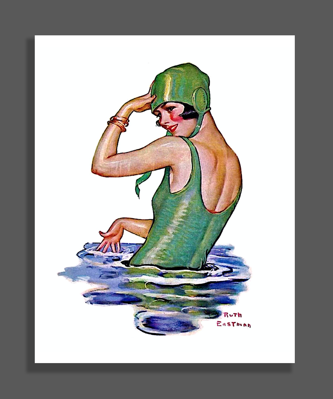 Description & Provenance: Antique Magazine Portrait Cover: The first, featuring this swimwear swimmer, is from a 1926 magazine cover. This was, of course, log before “Gidget” made surfing a phenomenon. “Judge” was an American magazine published from 1881 to 1947. One of its editors, Harold Ross, went on to launch ”The New Yorker.” Ruth Eastman - Bathing Beauty Artist: Ruth Eastman (of the Eastman Kodak family) was an artist who did cover magazines and advertisements for a variety of clients and magazines. This is one of her swimwear oriented pieces.
