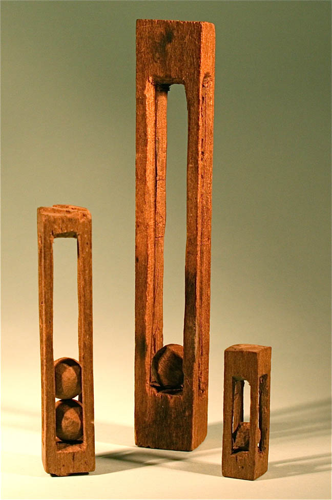 Title: Three little wooden ship folk art whittlings of balls-in-cages