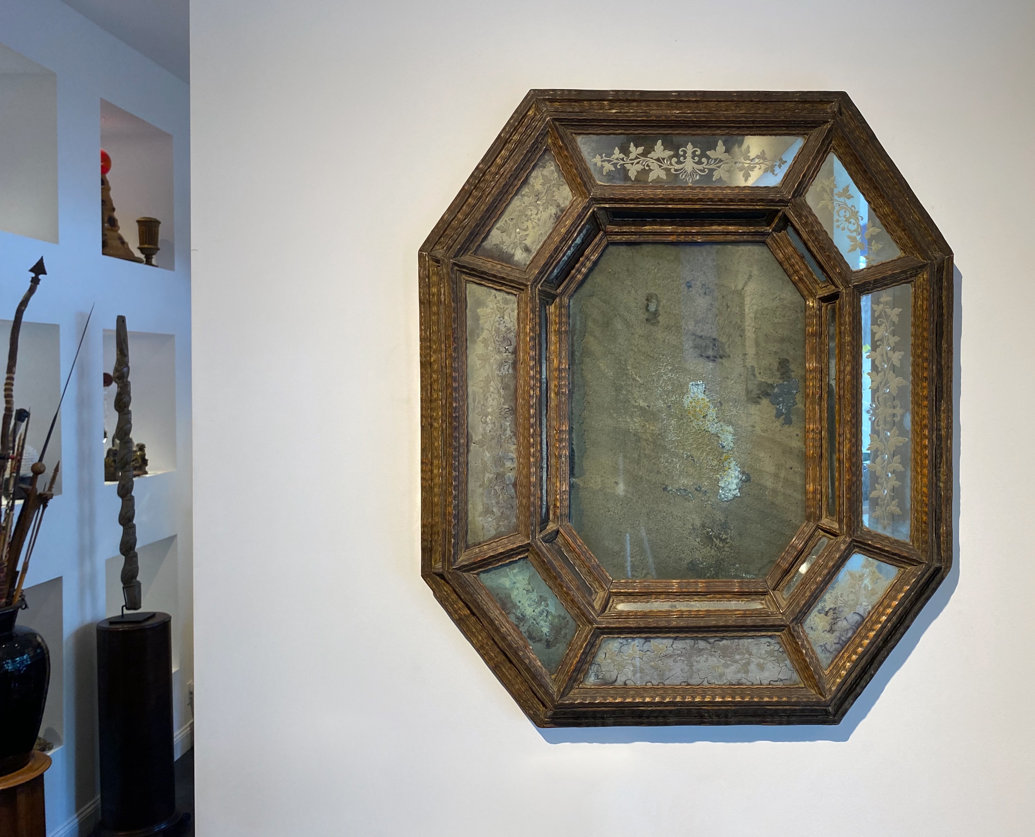 Fabulous look, A Rare Italian Gothic Neoclassical Multi-Faceted Octagon 3 Dimensional Faux-Antique Hand-Carved Wooden Original Mercury Mirror. The Italian Venetian Mirror has Faded in The last 150 years. gold gilding, Etched Flowers, and framed carved designs. Created around the 1850s. The workmanship is unbelievable, to have one made today would cost you a small fortune. This vintage item remains fully functional, but it shows signs of age through scuffs and dings. The age finishes are faded but beautiful. * Some history. Murano glass makers produced Venetian glass and this is what led to emergence of Venetian Mirrors. Glass made in Murano around the 15th Century was popular across Europe for it was a high quality, elegant, and beautiful product. The Venetian mirror was born on the tiny Italian island of Murano in Venice in the 15th century. Venetian mirrors were painstakingly produced, and creating one was a highly involved process. Mirrors have an intriguing and complex history which spans many countries and centuries. Mirrors have always had a clear appeal that makes it possible for people to view their image without hiding anything. The ability of mirrors to reflect natural and artificial light remains unrivaled. For instance, there was a superstition that if in case you happen to smash a mirror, you’ll have seven years of bad luck. Such a superstition originated from the ancient times as mirrors were sees as tools used by gods. Hence, they have always been coveted and appreciated since they were discovered. Before their discovery, ancient people would see a reflection of themselves in a lake or pond. People in ancient Egypt and Rome would use crude ways of seeing their reflection using mirrors made from metal and bronze. Without such reflection, mirrors would not be appreciated. In the early years, mirrors were actually believed to posses magical powers due to their ability to show a reflection. Once the technical problems of mirror production were conquered, it was time for the artisians to work their magic to make Venetian mirrors the highpoint of luxury. Early mirror frames used carved materials such as wood or ivory. Artists got to be so talented at this that sumptuary laws were passed forbidding certain carving styles from being possessed by lower-class people. Murano Island was the focal point for Venice's glass production. By the 16th century, nearly half of the island's 7,000 inhabitants were involved in the glass-making industry, and it is still a glass-making center today. Murano glass began making its way into the frames of their high-quality mirrors, using a variety of lampworking techniques such as smalto and millefiore. Murano's techniques were so prized that master glass artisans were forbidden to leave by law, and it was only with great bribes that a few were convinced to travel to other countries and share their secrets. Today, Murano glass has its own trademark of origin, certifying that the glass came from this historical location.