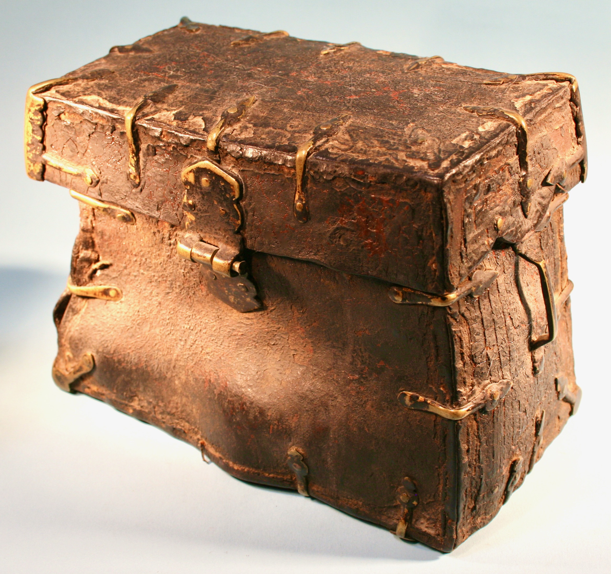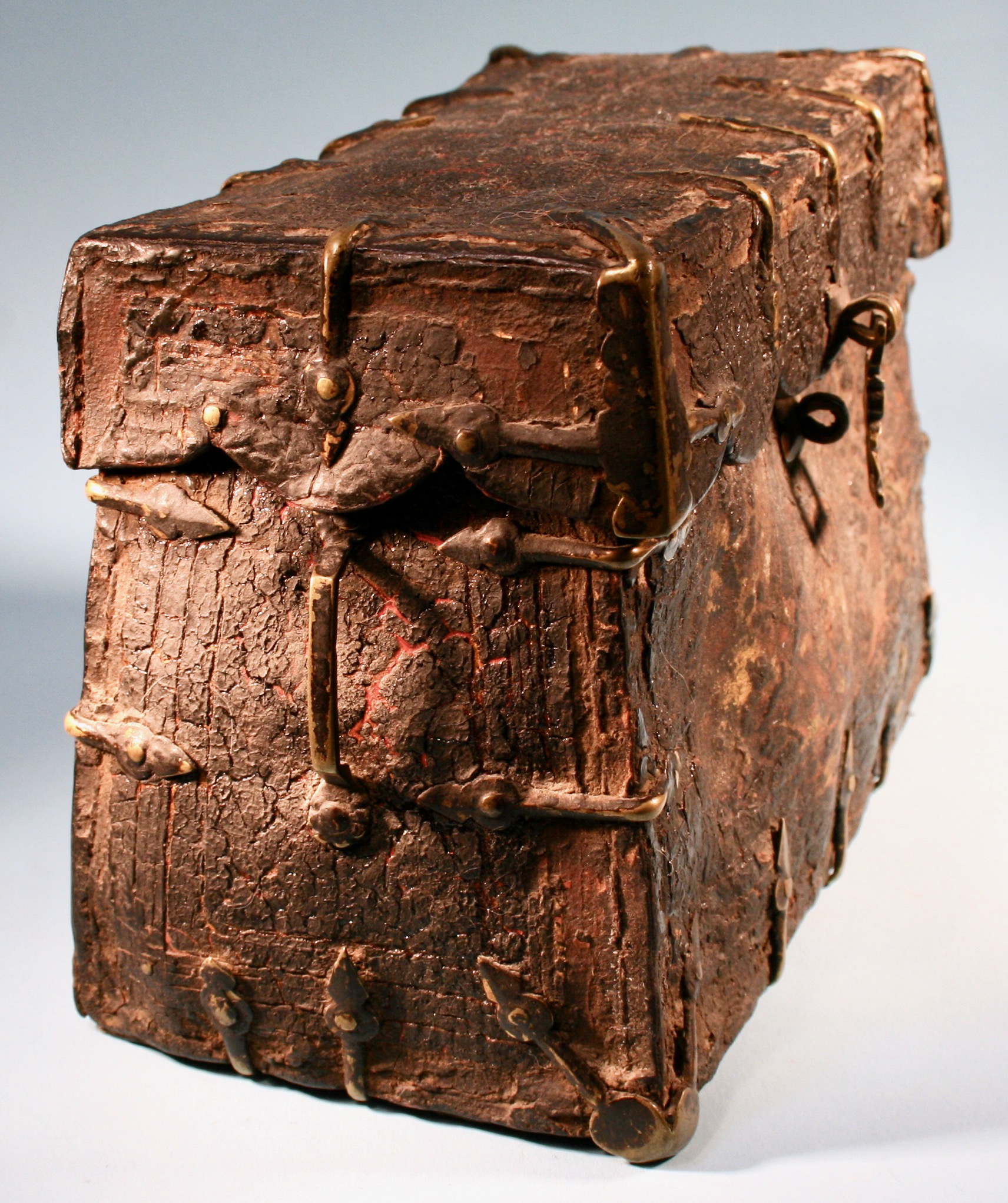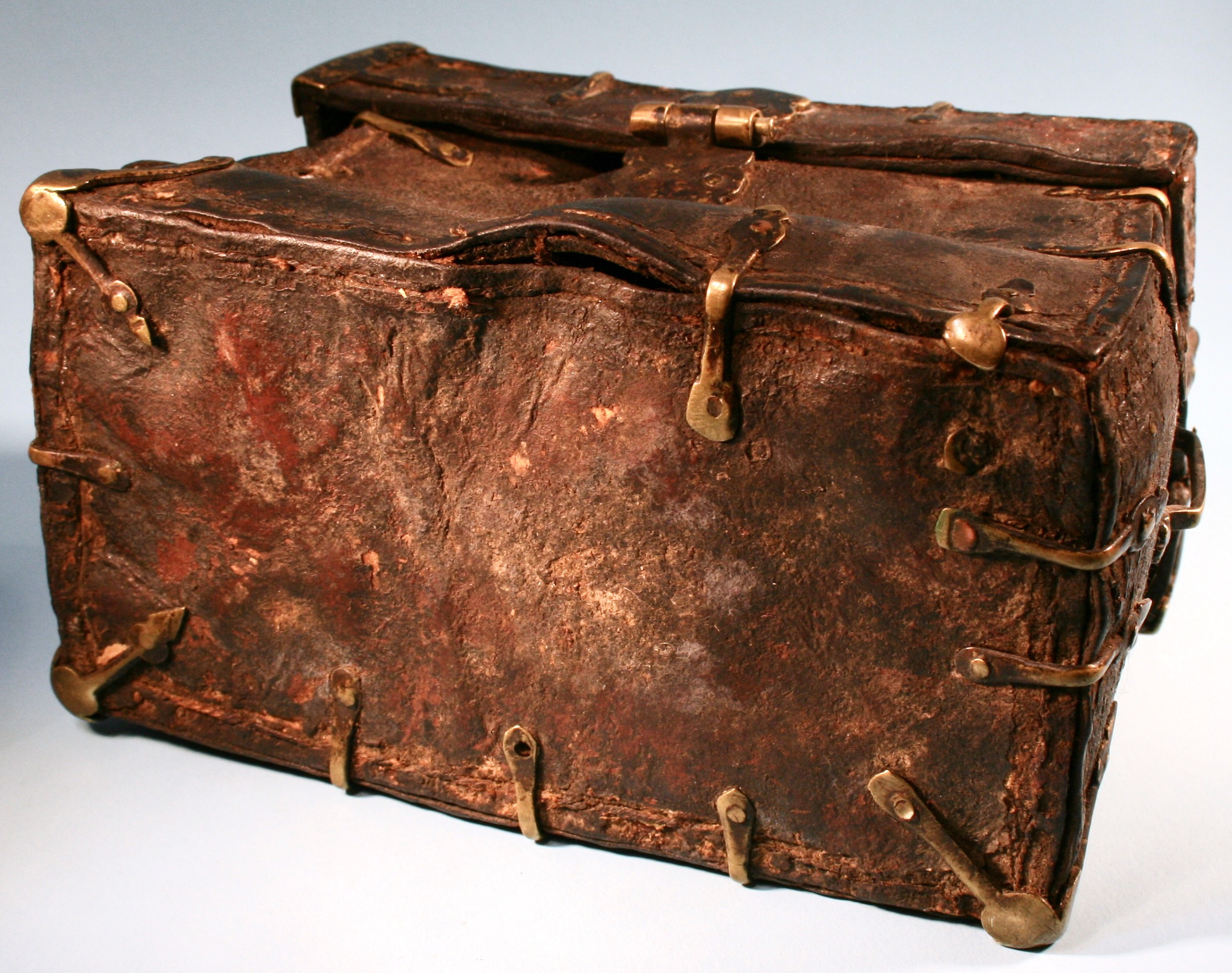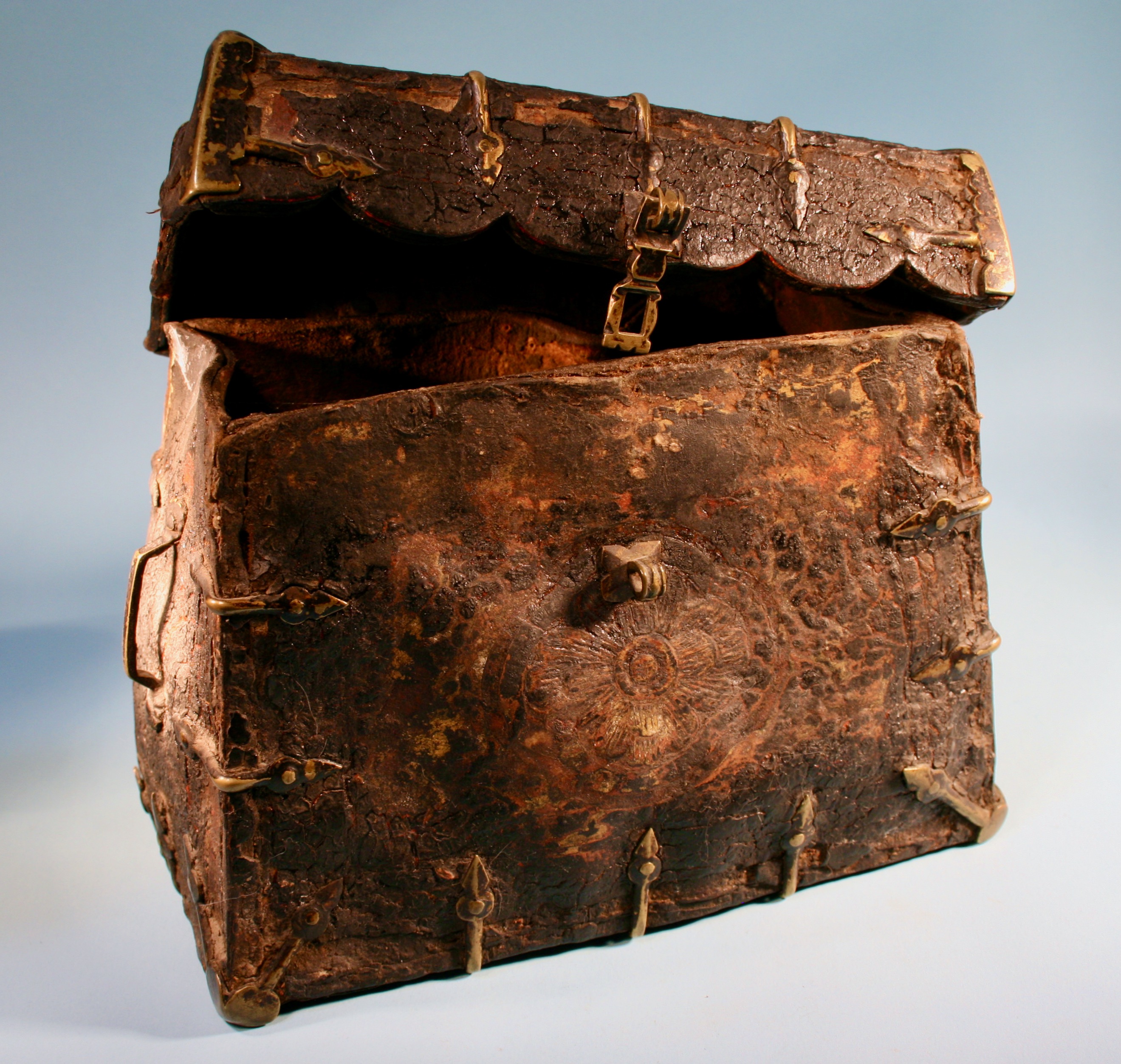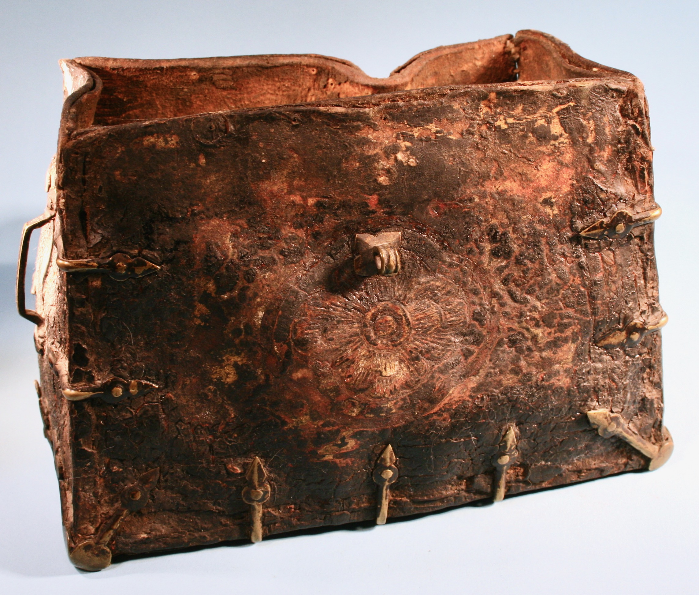 A rare 18th-century traveling document box. Decorative chest-like container made of yak leather decorated in religious designs. This is an Antique Handmade Leather Tibetan Traveling Keepsake box. This box is beautifully painted by a master Monk Artisan. It probably carried a variety of religious items As the month traveled through Tibet. A container from Tibet. Made from heavy thick leather and copper hardware and finished with Tibetan Handpainted Designs threw out the box. Traveling altar used by the monks who go on pilgrimage. Condition is good for its age, there are lots of age traces. See pictures.