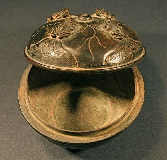 Title: Antique 18th Century Japanese Bronze Four Frog Engraved Pill Box