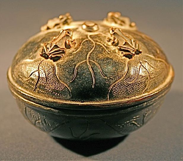 Super rare old Japanese spectacular container. A charming antique indeed, this small Japanese bronze pill box from the early 18th century features an exquisite design with four frogs adorning the lid. Each box showcases meticulous hand-etching, portraying a delightful combination of floral patterns and frog motifs. Crafted to the highest standards, this pill box emanates charm, character, and quality. Any Collector would be proud to own this unique art piece. Japanese bronze art has a rich and intricate history that spans centuries. The tradition of bronze casting in Japan can be traced back to the Yayoi period (300 BCE – 300 CE), where small bronze items were crafted for utilitarian purposes such as mirrors and weapons. However, it was during the Nara period (710–794) and the Heian period (794–1185) that the art of bronze casting began to flourish. In the late Heian period, Buddhist sculptures and temple bells became prominent examples of Japanese bronze art. Skilled artisans employed the lost-wax casting technique, allowing for intricate details and expressive forms. These pieces often served religious and ceremonial purposes, contributing to the grandeur of Buddhist temples. The Kamakura period (1185–1333) marked a shift in the focus of bronze art from religious to secular subjects. With the rise of the samurai class, demand for decorative items, armor, and weaponry increased. Japanese sword fittings, known as tsuba, started to showcase elaborate bronze craftsmanship. The Muromachi period (1336–1573) saw the emergence of tea culture, influencing the production of bronze incense burners, tea kettles, and other utensils. Artisans like the famed Myochin family specialized in crafting intricate armor and household items. During the Momoyama period (1573–1603) and into the Edo period (1603–1868), peace and stability allowed for artistic refinement. Japanese bronze artisans created exquisite sculptures, vases, and ornamental pieces. Notable artists like Ono Sadakatsu and Suzuki Sadatsugu produced masterpieces, often commissioned by daimyos and wealthy merchants. The Meiji period (1868–1912) witnessed a significant transformation as Japan opened up to the world. Western influences and industrialization impacted artistic styles, leading to a fusion of traditional Japanese craftsmanship with modern techniques. Bronze sculptures and decorative arts gained international acclaim during this era. In the contemporary period, Japanese bronze art continues to evolve, blending traditional techniques with innovative designs. Artists explore a wide range of themes, from traditional motifs to avant-garde expressions, contributing to the ongoing legacy of Japanese bronze craftsmanship.