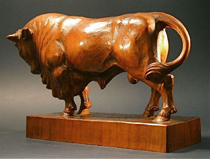 Title: Large Antique Art Deco Graphic Wooden Hand Carved Bull