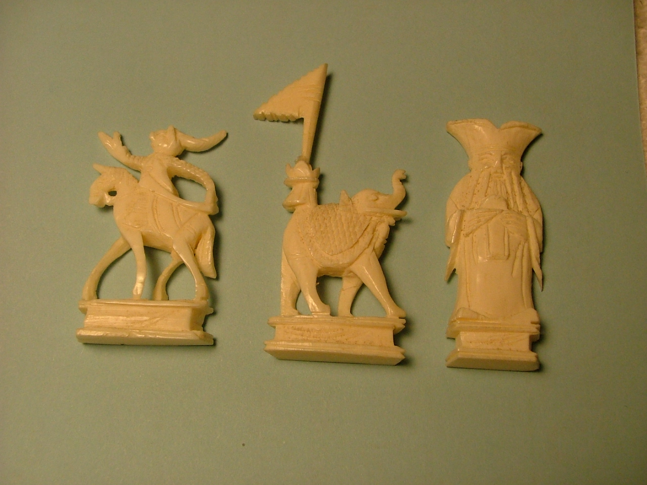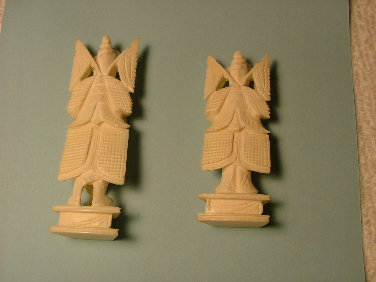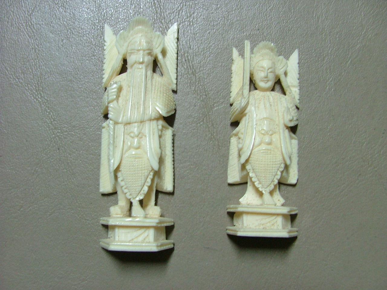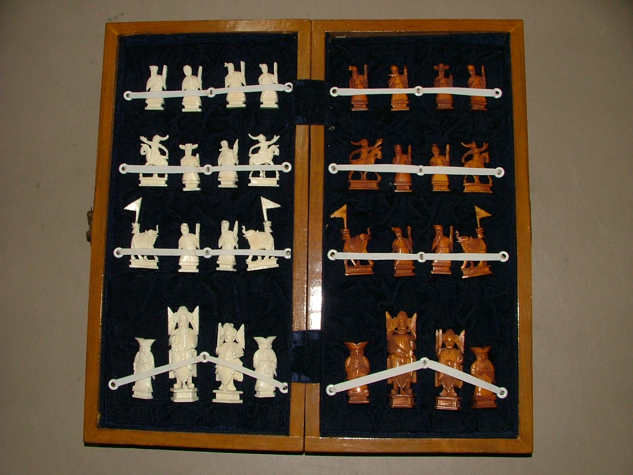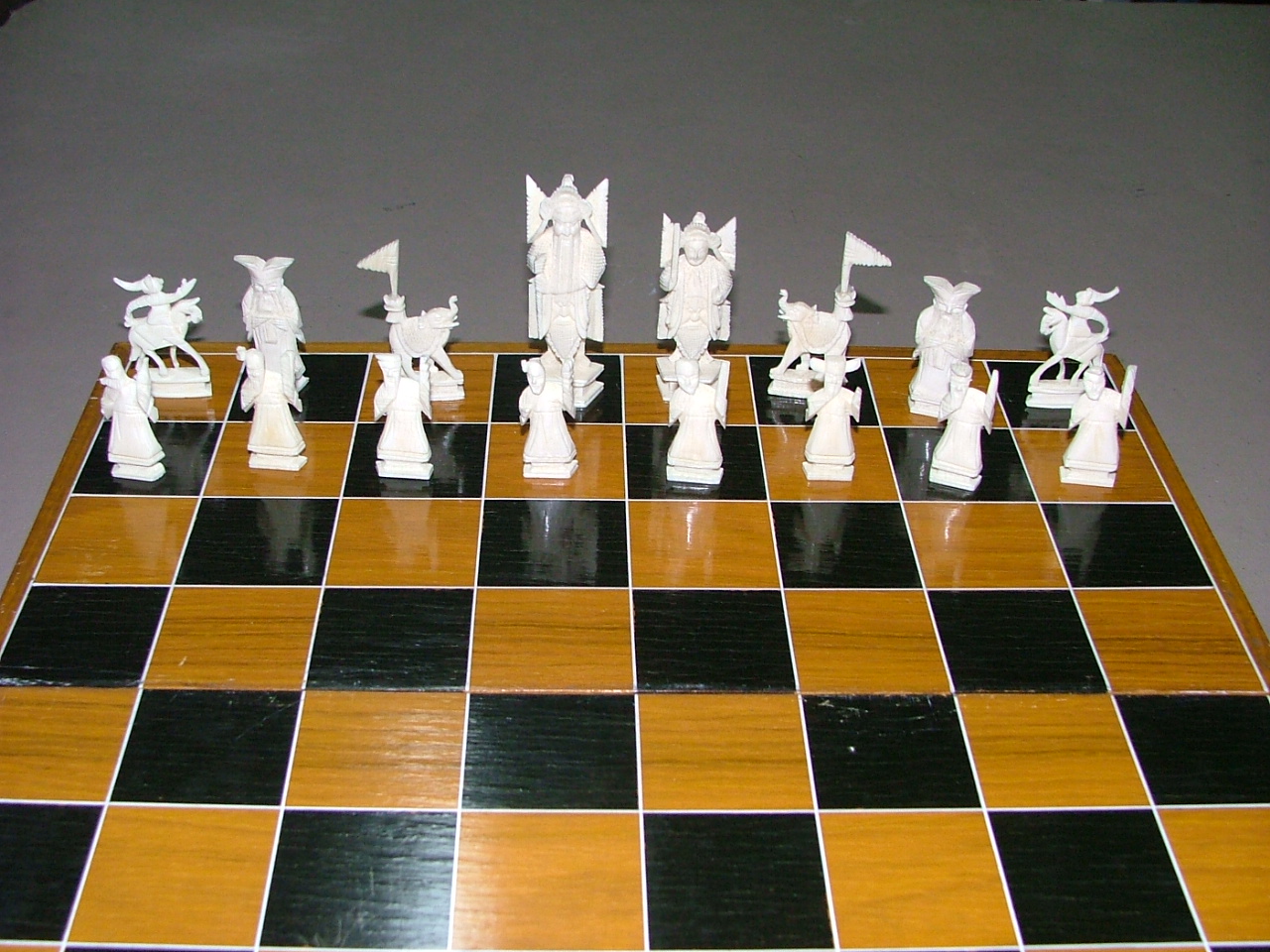 Pre-Ban elephant ivory chess set brought in the U.S. from Asia in 1960. Each figures are hand carved. boxed chess board is 14" X 14", largest figure is 3" X 1" X 5/8"; smallest figure is 9/16" X 3/8" X 5/16"
