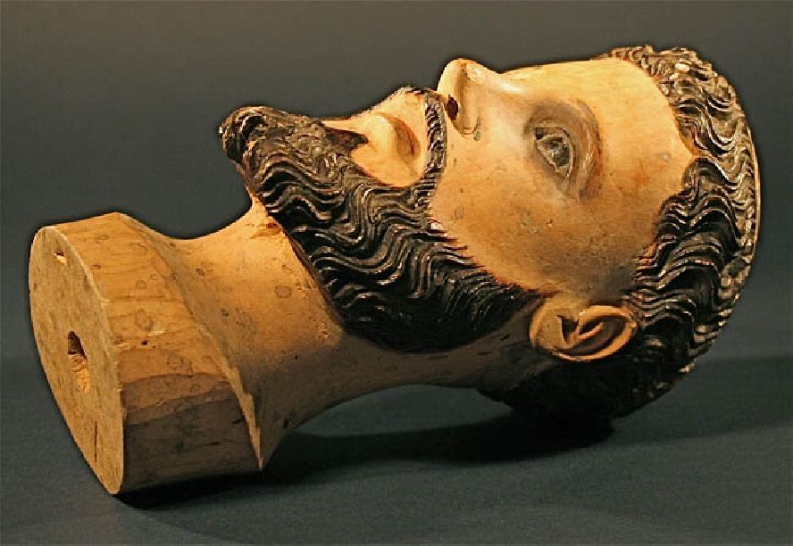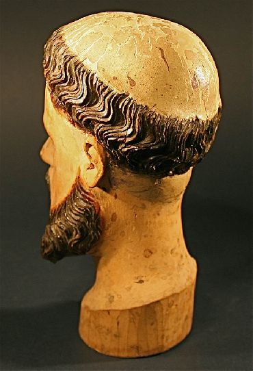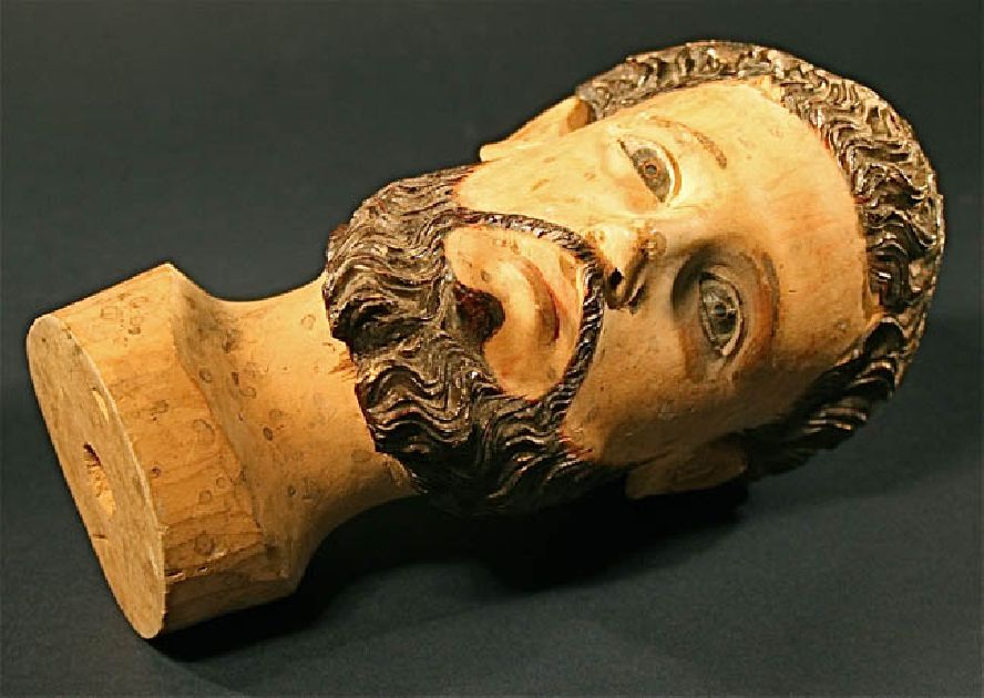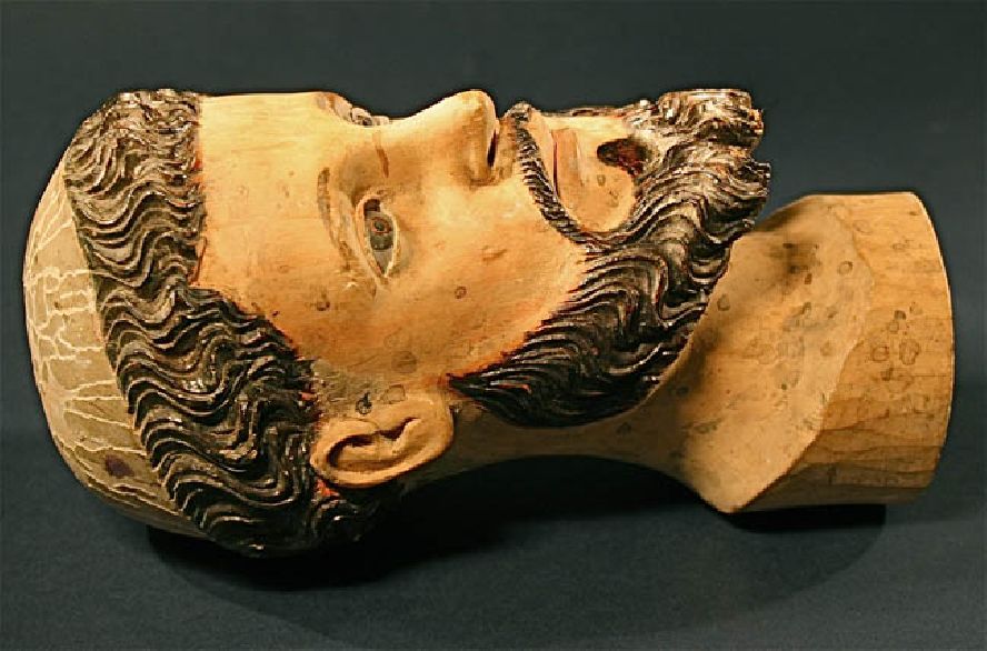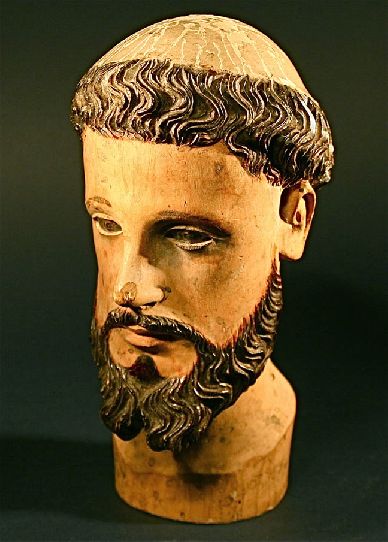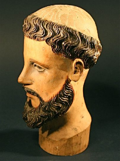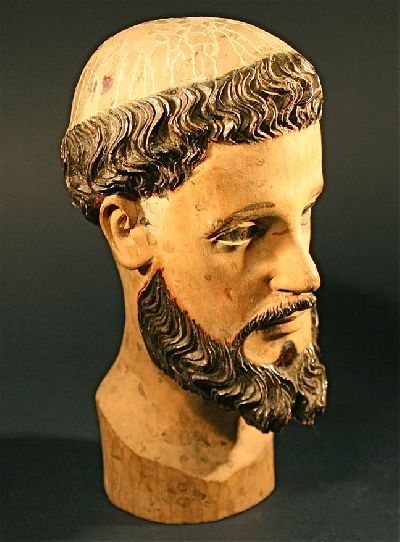 This 18th or 19th century Head of a Santos is finely sculpted from solid light wood. This is a One Of A Kind carving. with inset glass eyes and carved hair. The intricate carving has been executed by a master. Though this Santos is missing his body, the condition of the head is perfect -- a rare find. This is a great work of art and a very charming French, colonial carving.
