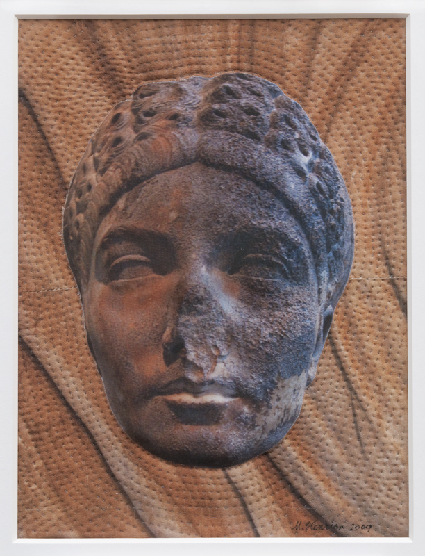 Matidia by artist Marilyn Henrion. Mixed media textile relief: Digital photography, inkjet printing on silk and cotton, fusing, trapunto, hand quilting. Double matted and framed. (work is 12"x9", 18"x15" framed)). The striving for immortality has been present in civilizations throughout the ages, from cave dwellers to the present. In this quest we have often turned to art to preserve something of ourselves and our values when we are no longer here to speak. This series of works pays homage to these attempts by focusing on the haunting faces of marble portrait sculptures from ancient Rome at New York’s Metropolitan Museum of Art. Marilyn Henrion extracts images from photographs she has taken of these works and prints them onto cloth. Combining these with details from Roman sarcophagii and statues from the same period, she creates textile collages, animating the surfaces with trapunto relief and hand quilting. The presence of Henrion’s hand stitching adds yet another layer to the quest for transcendence embedded in the construction of these contemporary works.