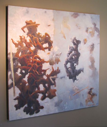 Abstract surrealist oil on canvas painting by fine artist Durand Seay. The artist uses symbolic gestures to portray the difficulties in receiving approval and acceptance. The work is surrealistic in nature, creating a representation of the subconscious mind through fantastic or narrative imagery that pursues a symbolism of our spiritual connections. With Seay’s intuitive nature, his work is guided by spontaneity, expressing a language driven by structures or forms found in nature. Durand Seay’s work, like an architect, presents that examination of movement, an expression of time in space. His thinking is that of a camera, capturing that instant feeling of the wind against ones face.