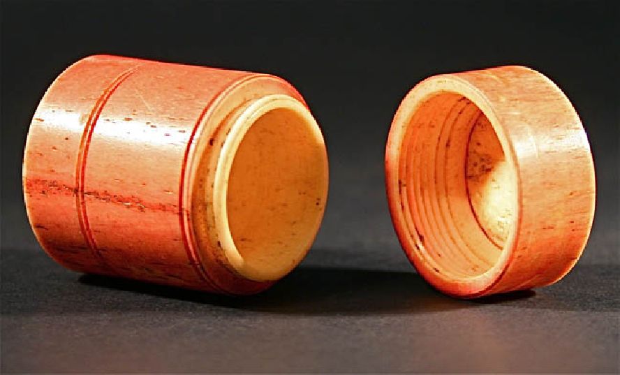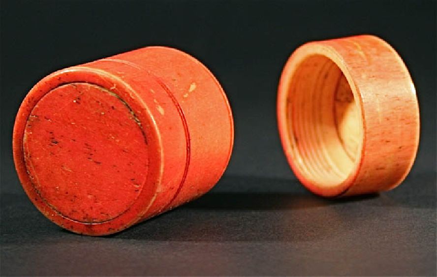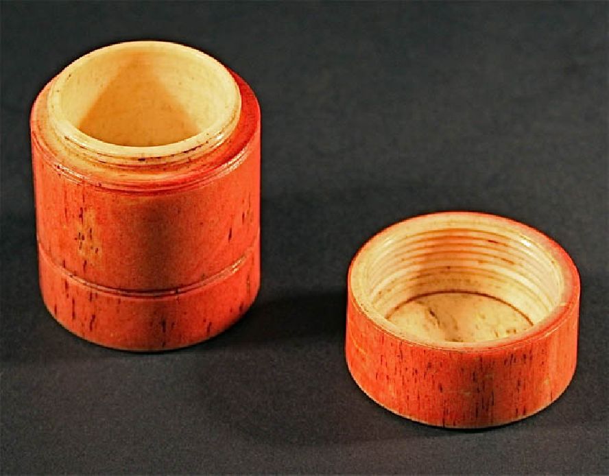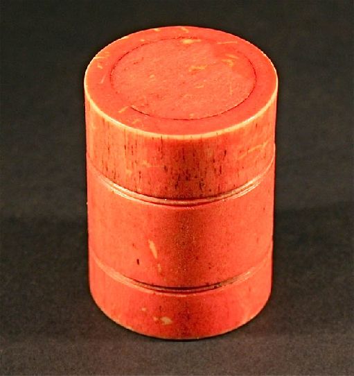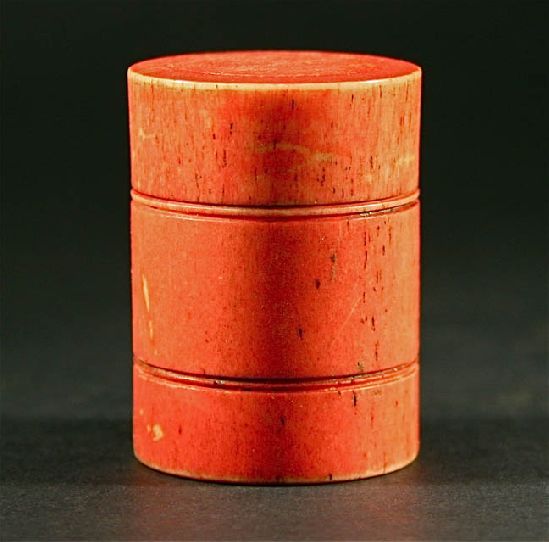 Amazing red bone box, small round bone looking bone box with a movable lid. This box is in very fine condition. This artifact would make a wonderful display in any personal home. This was from an original collection of boxes with all the great character and quality one looks for in a box. This piece was crafted with great skill and delicacy. If you are looking for a small gift item or a museum-quality purchase of a lifetime, our hope is you are able to see the craftsmanship in all of these hand-picked objects.