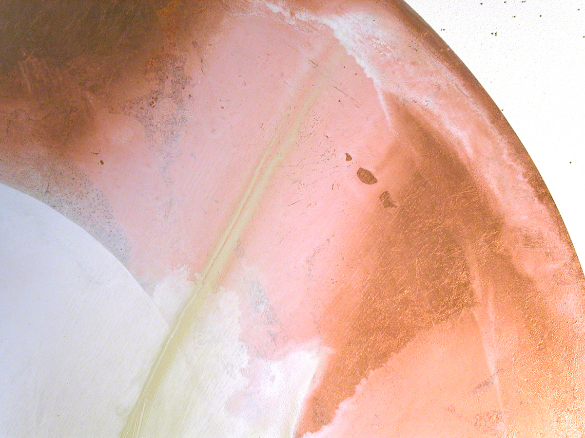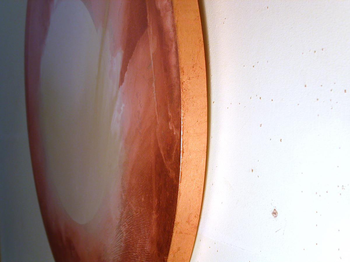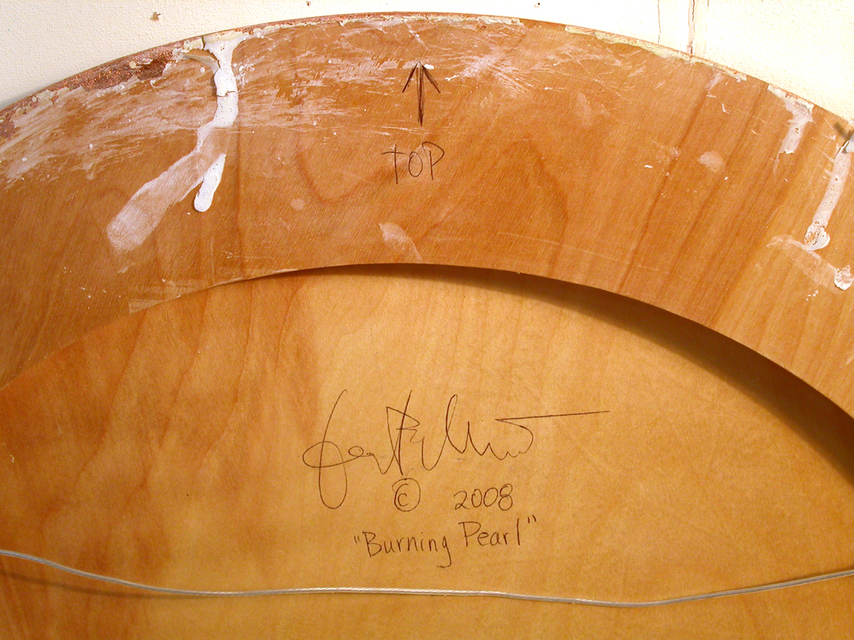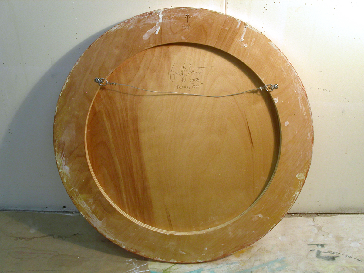 Burning Pearl is an oil painting created on a round, wooden panel. The panel was gilded with copper leaf before the image was painted. The wooden panel was created by Simon Liu using Baltic birch plywood. The surface was prepared with contemporary gesso which contains an acrylic binder. The gesso was sealed and a gilding size was applied on which the copper leaf was adhered. The copper was then sealed to prevent tarnishing. A circle was faintly inscribed, the pearl, prior to the washes of very thin oil paint.