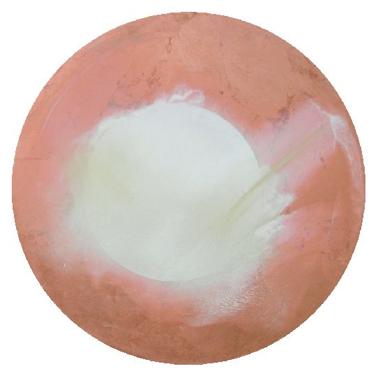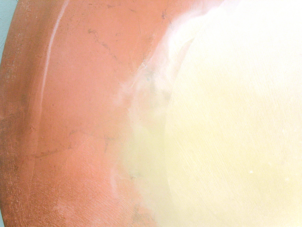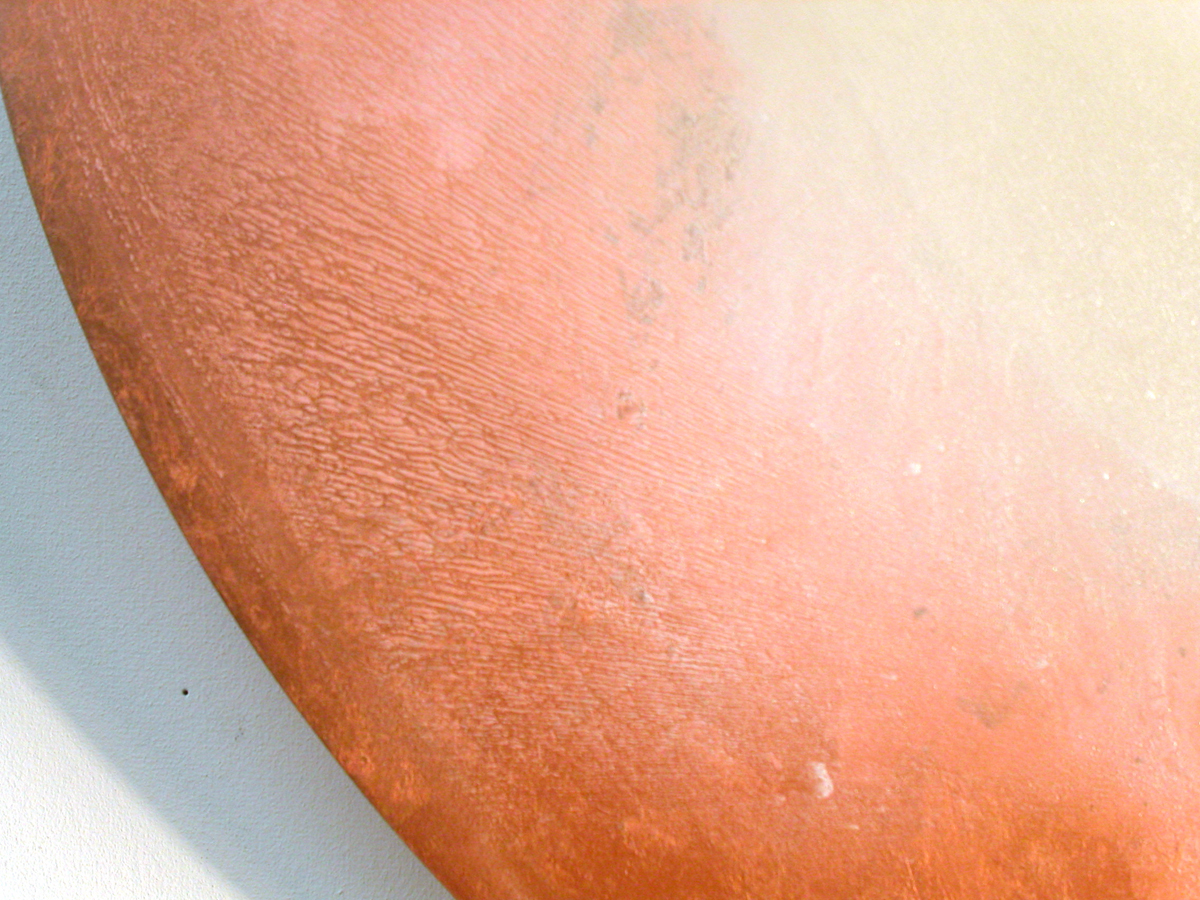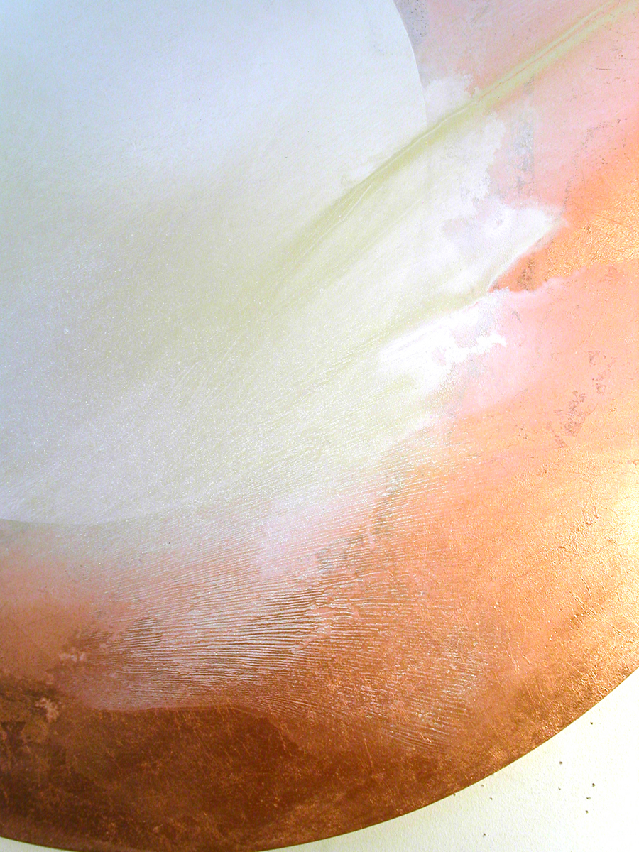 Burning Pearl is an oil painting created on a round, wooden panel. The panel was gilded with copper leaf before the image was painted. The wooden panel was created by Simon Liu using Baltic birch plywood. The surface was prepared with contemporary gesso which contains an acrylic binder. The gesso was sealed and a gilding size was applied on which the copper leaf was adhered. The copper was then sealed to prevent tarnishing. A circle was faintly inscribed, the pearl, prior to the washes of very thin oil paint.